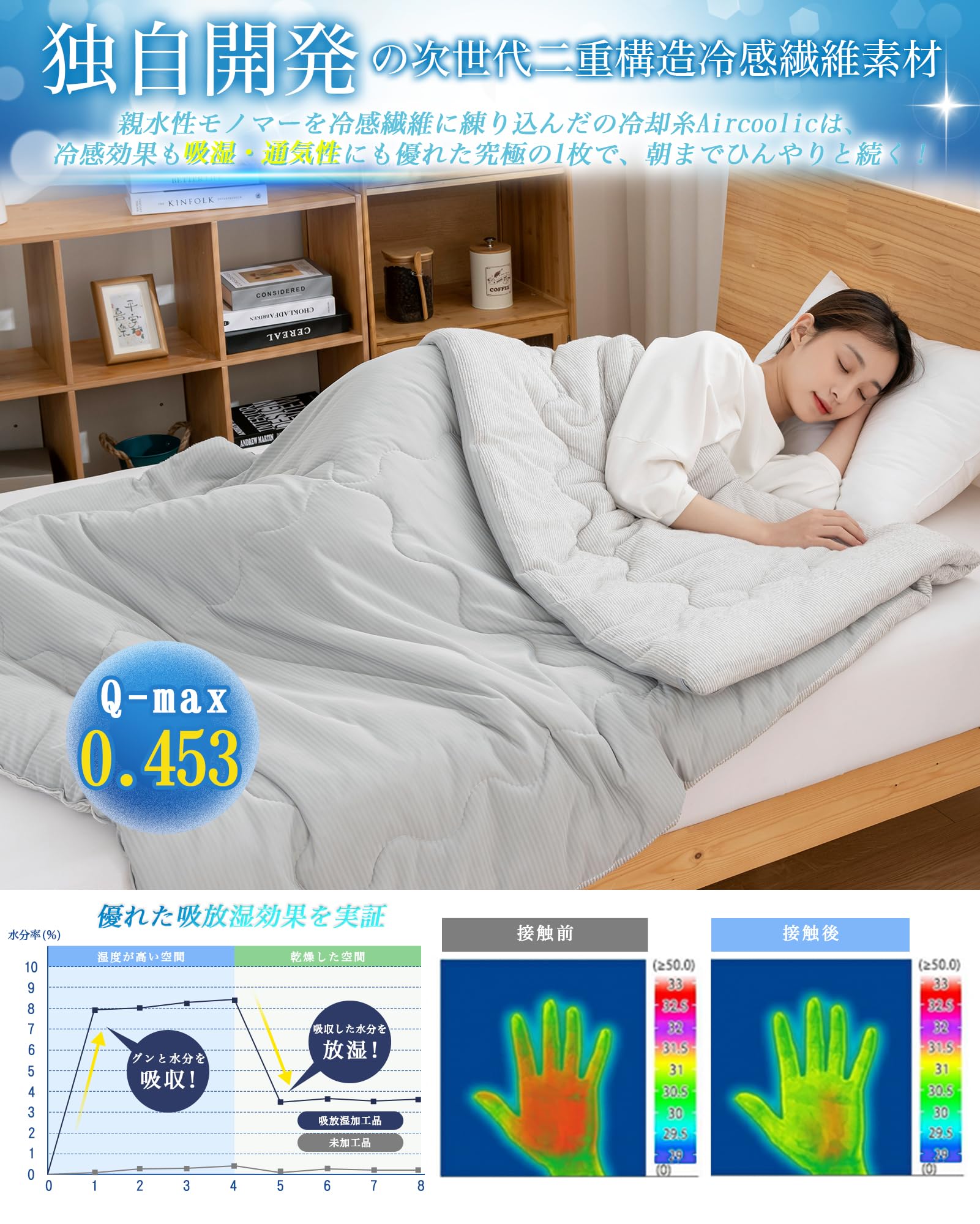 ❄【瞬ひんやり接触冷感、夏をより快適!】独自開発の次世代二重構造冷感繊維素材Aircoolicを採用し、冷感効果も吸湿・通気性にも優れた究極の1枚で、生地に触った瞬間ひんやりしますので、暑い夜の寝始めを快適にサポートします。冷房との併用でさらにひんやり!