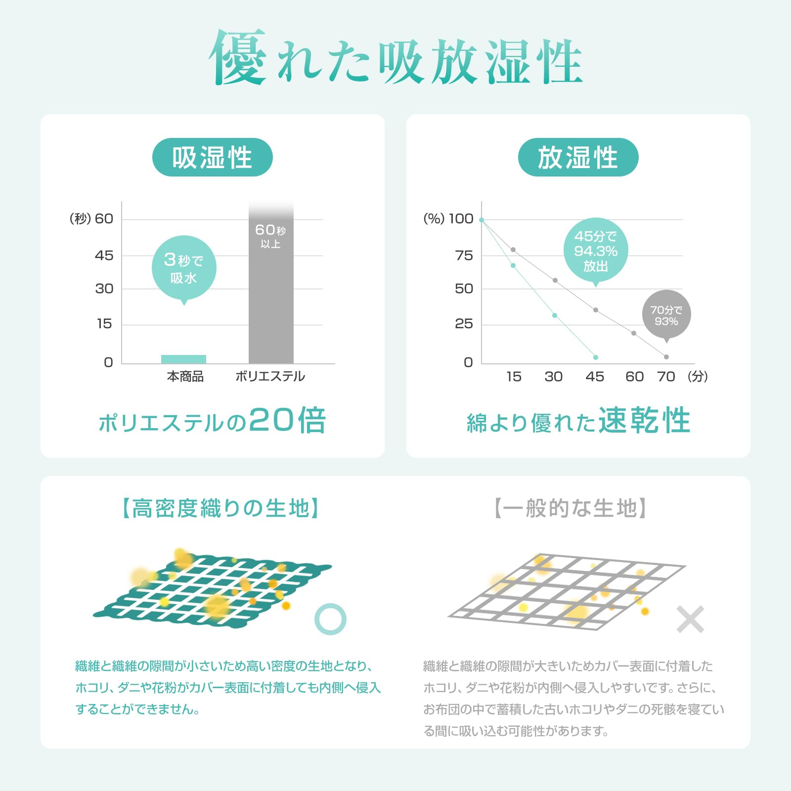 【抗菌防ダニ加工】詰め物に抗菌防臭加工のおかげて、湿気や汗でジメジメする季節には、細菌の増殖(ダニ、カビ等)、汗や皮脂のニオイを抑制するので清潔感を保ち快適に過ごせます。布団の中にダニが侵入しないように糸と糸の隙間を小さく縫い目の幅も通常の生地より細かくなります。