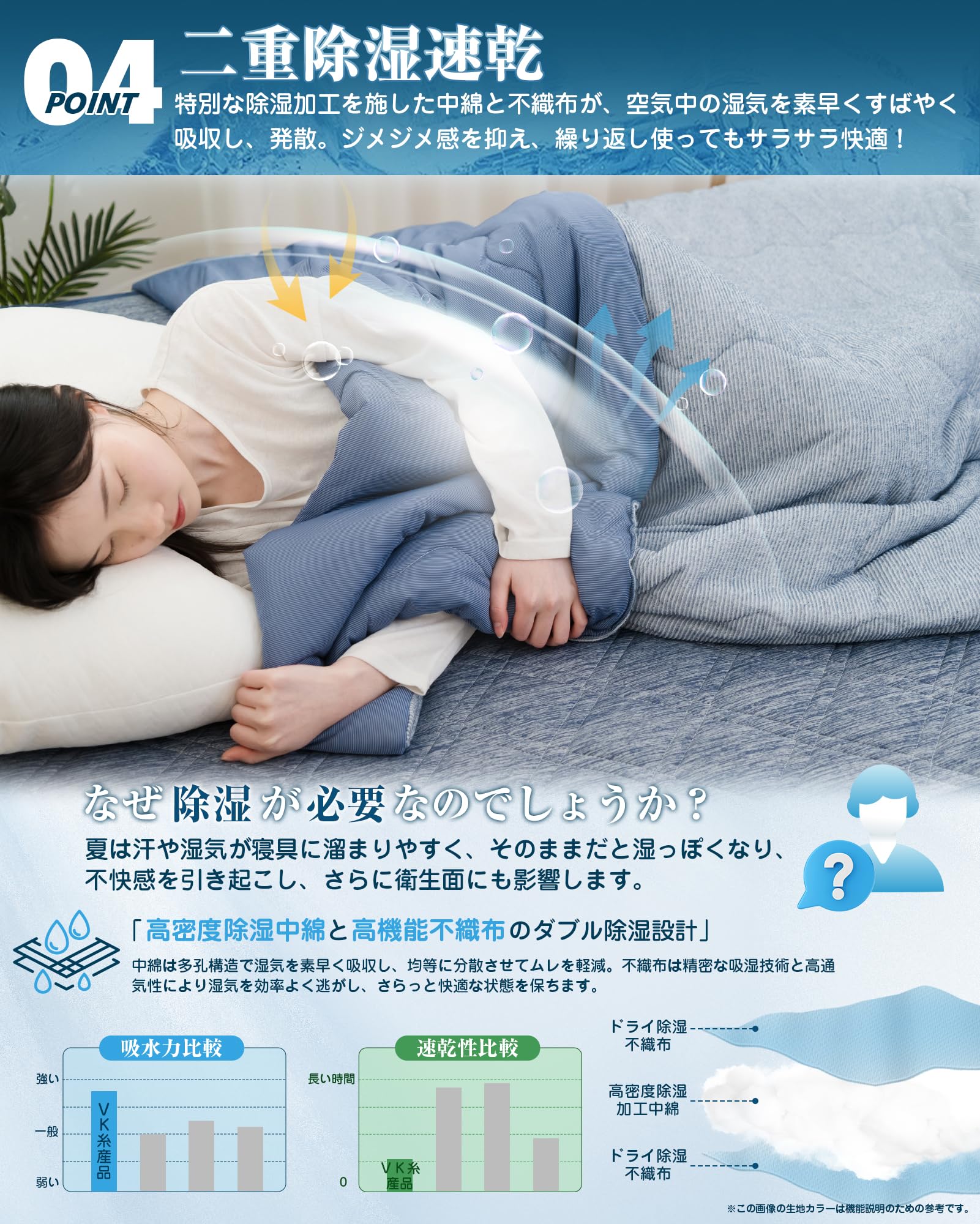 【二重除湿速乾】夏の寝苦しさは、温度だけでなく、湿気も夏の寝苦しさの要因となる。特別な除湿加工を施した中綿と不織布が、空気中の湿気を素早く吸収し、発散する。湿度を50±5%に近づけることでじめじめ感を解消、繰り返し使ってもサラサラ快適!
