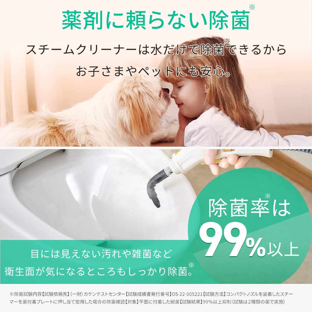 ※除菌試験内容【試験依頼先】(一財)カケンテストセンター【試験成績書発行番号】OS-22-005221【試験方法】コンパクトノズルを装着したスチーマーを菌付着プレートに押し当て使用した場合の除菌確認【対象】平面に付着した細菌【試験結果】99%以上抑制(試験は2種類の菌で実施)