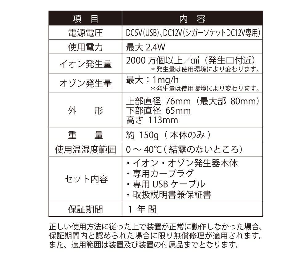 マイナスイオン×オゾンのダブル効果で除菌&消臭:本体内部でマイナスイオンとオゾンを発生させて空気をクリアに保ちます。放出されたマイナスイオンが車の中やお部屋の中に広がり、浮遊する物質やウイルス、花粉やハウスダストや悪臭の原因を捉え、適正量のオゾンの力でそれらの有害物質や浮遊菌を分解・除去するため、いつでもフレッシュでクリアな空間をお楽しみいただけます。