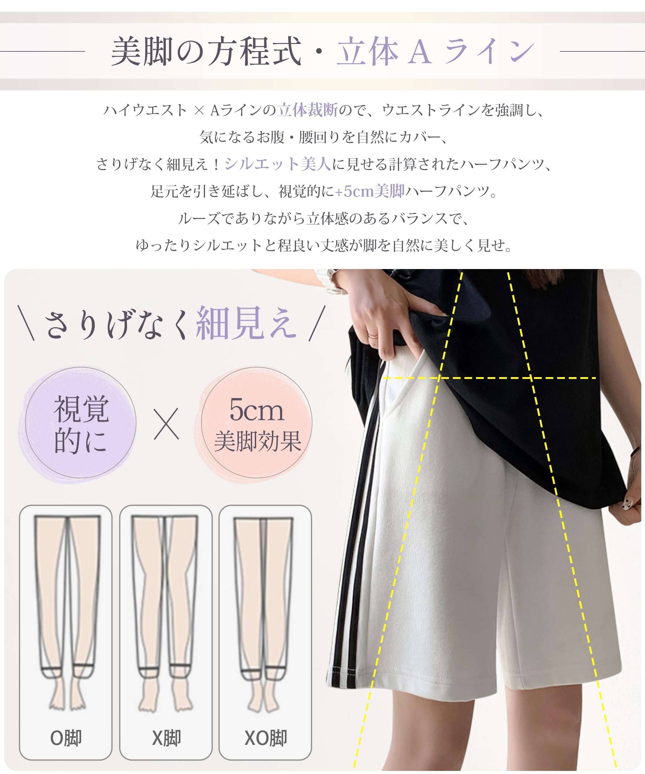 ✨【美脚の方程式・立体 A ラインで細見え効果】シンプルながらも洗練された定番デザインに、ハイウエスト仕様を採用ハーフパンツ。ハイウエスト × Aラインの立体裁断ので、ウエストラインを強調し、気になるお腹・腰回りを自然にカバー、さりげなく細見え!シルエット美人に見せる計算されたハーフパンツ、足元を引き延ばし、視覚的に+5cm美脚ハーフパンツ。ホワイトストライプサイドのルーズフィットハーフパンツ。ルーズでありながら立体感のあるバランスで、ゆったりシルエットと程良い丈感が脚を自然に美しく見せるハーフパンツです。カジュアルから休日のお出かけまで、シンプルなデザインがさまざまなトップスと好相性。