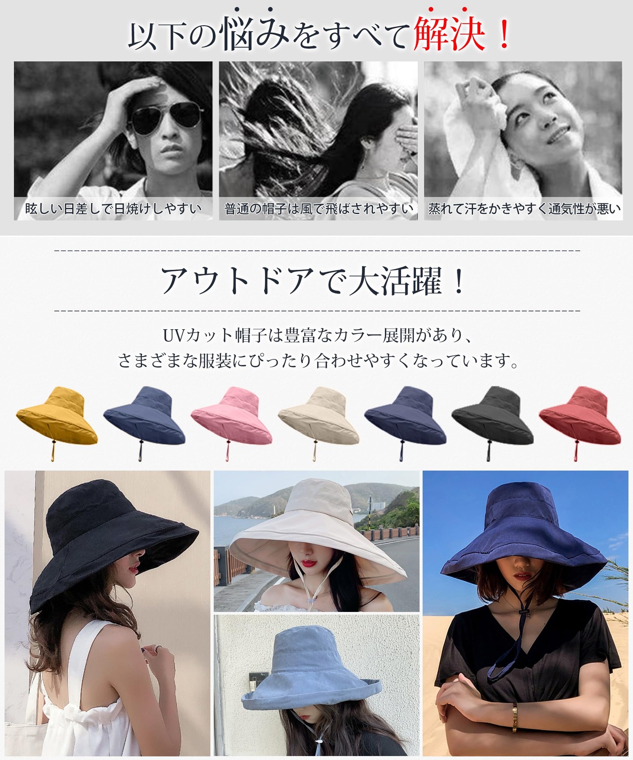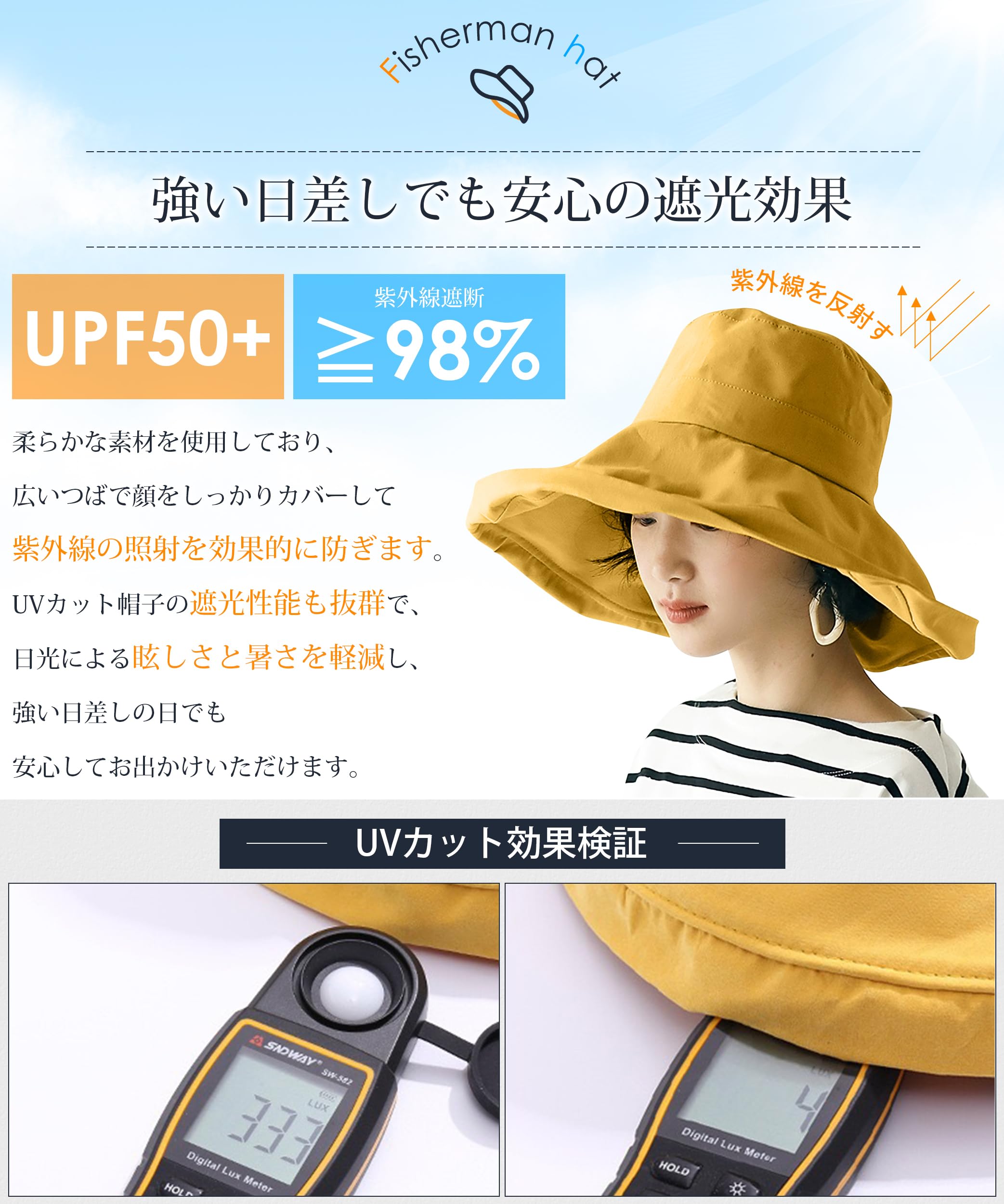 【強い日差しでも安心の遮光効果】 帽子 レディースは柔らかな素材を使用しており、広いつばで顔をしっかりカバーして紫外線の照射を効果的に防ぎます。つば広デザインの帽子 レディースは日傘のように顔から首元までしっかり覆い、紫外線を完全にブロックして肌を守ります。UVカット帽子の遮光性能も抜群で、日光による眩しさと暑さを軽減し、強い日差しの日でも安心してお出かけいただけます。