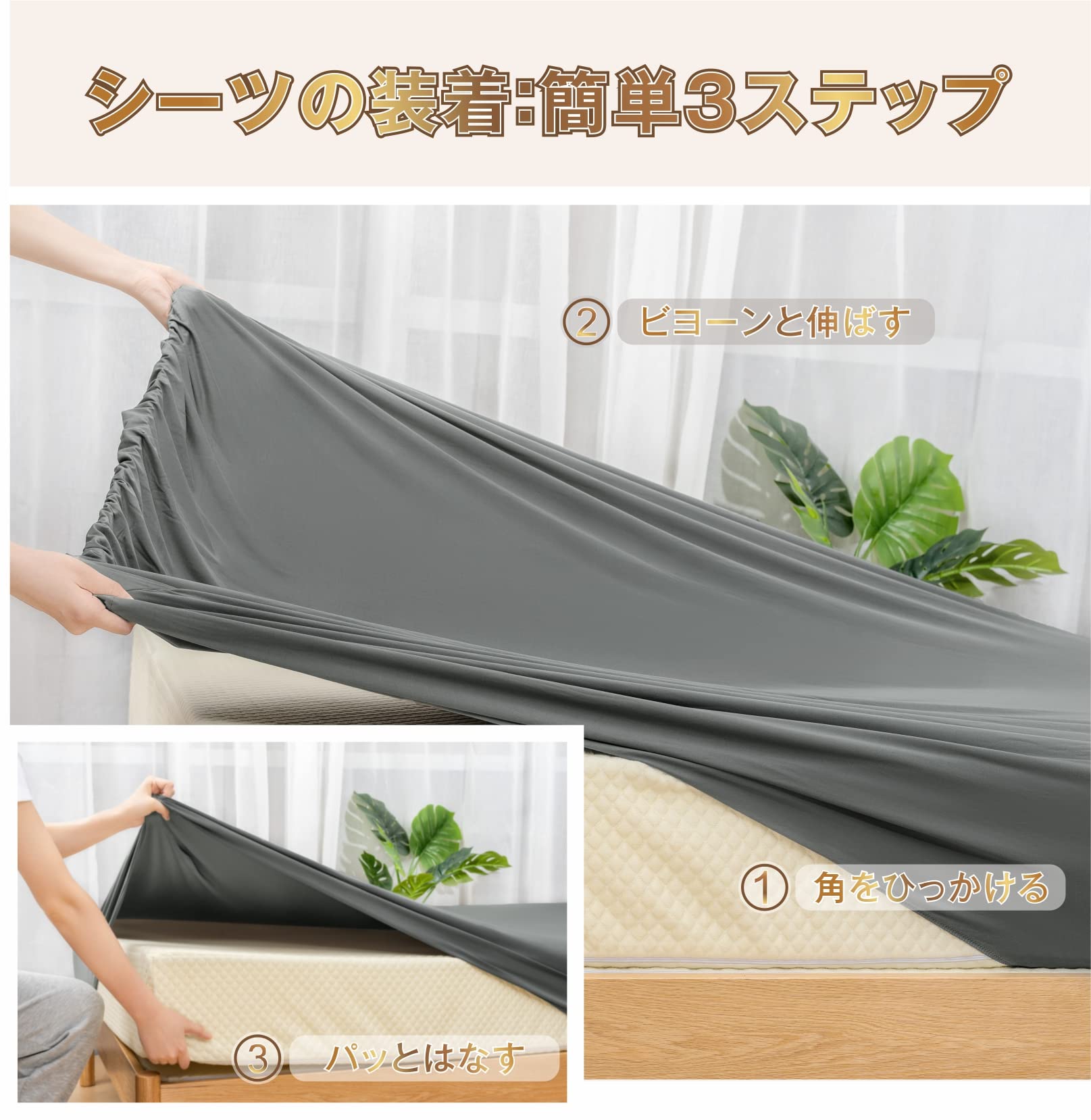 【全周ゴム・ズレ防止機能で脱着簡単】 ボックスシーツの全周は良質のゴム糸を織りこんで作られ、千回ほどの伸縮テストに通り、丈夫長持ちです。マットレス用、敷ふとんなどにも使えます。繰り返し寝返ってもズレにくく、寝相が悪くても大丈夫です。毎朝時間をかけて整理する必要がありません。 リュクスなスタイルと、シルクのような肌触り。必要なのは、新しいフィットシーツだけかもしれません。予備のシーツを数枚入れておくと、すぐに着替えできて便利です。どんな場面でも、この柔らかで心地よいシーツは最適な選択です。