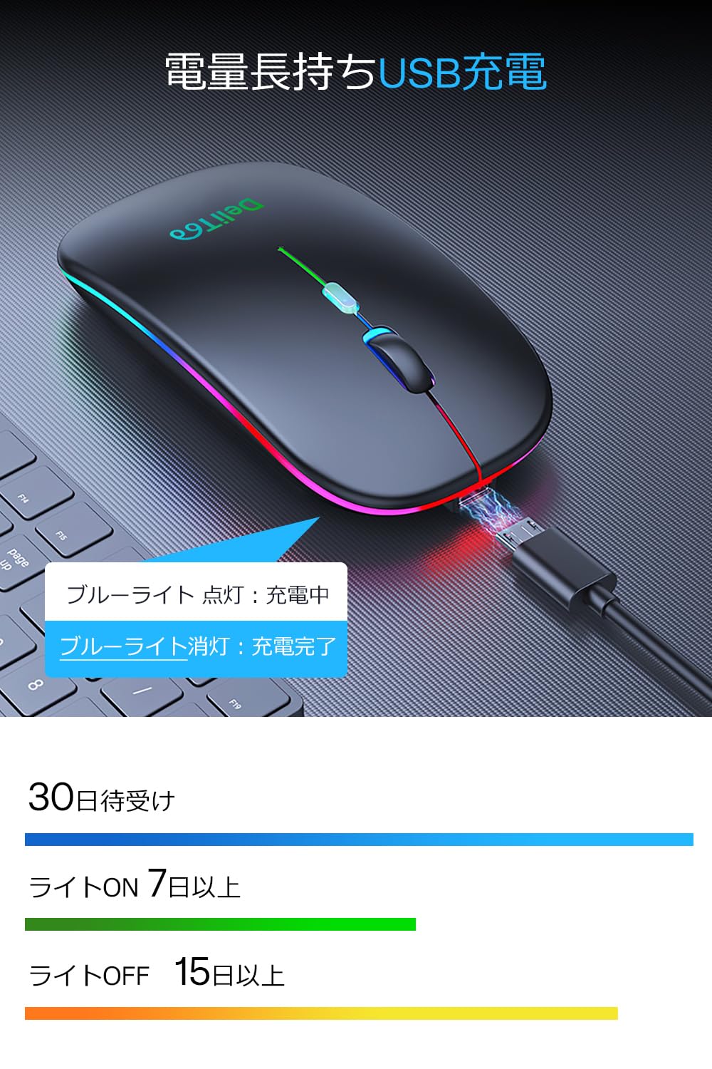 マウス 無線 静音 【薄型&高精度・高感度】 ワイヤレスマウス 3段階DPI切替 7色ライト付き 2.4GHz 節電モデル 小型 光学式 高精度 左右対称 無線 充電式 軽量 握りやすい 簡単接続 携帯便利 パソコン Windows Mac PC対応 (ブラック)