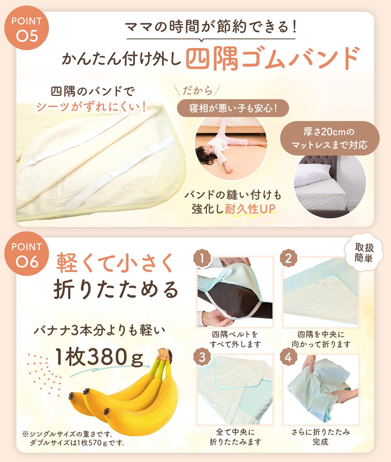 ◆小さなお子さまでも安心!ふわふわな表面で安眠を。表面はパイル地でしっかり吸水しますが、ゴワゴワ感が残りません。速乾性もあるので、いつでもサラサラ!寝苦しさからも解放されて安眠に。柔らかな素材なので、お肌が敏感な赤ちゃんでも安心して使用できます。寝相が悪くても大丈夫!四隅ゴム付き。四隅にしっかりとしたズレ防止のゴムがついているので、寝相が悪いお子さまでも安心です。また、取り付け・取り外しが簡単にできるので、洗濯時も時短になりストレスフリーです。