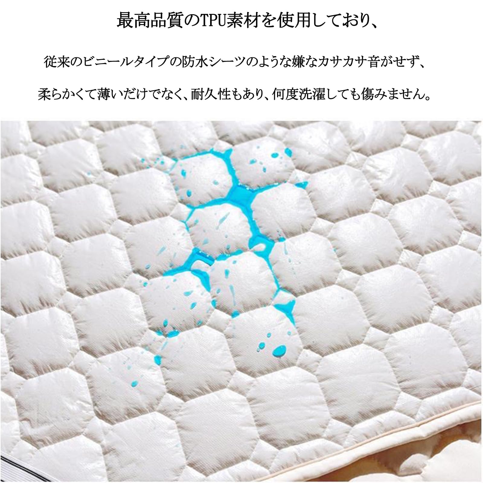 【防水三層構造3.0・音なし】ボックスシーツは100%防水のため素材浸透しにくい、シーツ裏面裏地TPUの防水加工生地がマットレスや敷布団を水分、汚れから守ります。新しい3層のポリエステル—空気層—TPU デザイン、通気性と柔らかさが向上するだけでなく、防水シーツ特有のゴワゴワ感やガサガサ音が完全に“ゼロ”です!より頑丈な素材とより科学的なデザイン、より優れた防水性能を達成。
