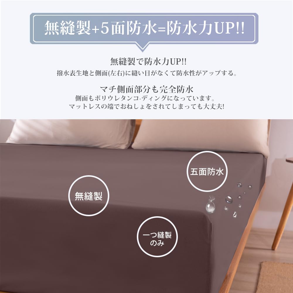 ●【全面・マチ側面部分も完全防水 Oeko-tex認証】撥水タイプは、表面(体が触れる面)が加工されているため、水分が表面に留まり、裏面に達しない構造となっております。裏面加工ではないので、通気性はありますが、濡れた部分に圧力がかかると、裏面まで漏れ、布団も濡れてしまいます。防水タイプは、表面が水分を吸収し、ポリウレタンコーティングされた裏面がそれをシャットアウトします。そのため、水分は裏面を通さず、布団が濡れる心配もありません。(OEKO-TEXは、常に変化する世界の安全基準に対応するために、最先端の情報に適応しています。そのため、日本に留まらず、世界の厳しい安全基準を設ける国の規制にも適応できす、世界トップレベルのテキスタイル安全基準です。)
