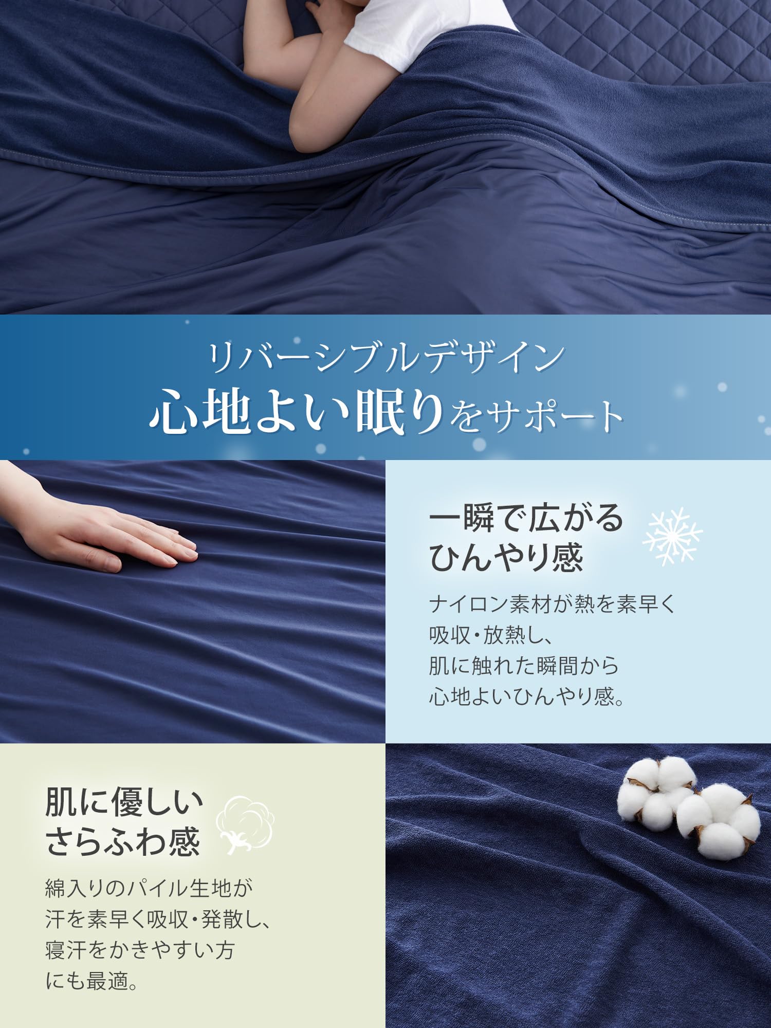 【圧倒的な冷感】体温を素早く拡散する接触冷感生地を使用。触れるたびにヒヤッと気持ちよくて、火照った体を瞬間冷却!暑くて寝苦しい夜でも極冷えで快適に眠れます。