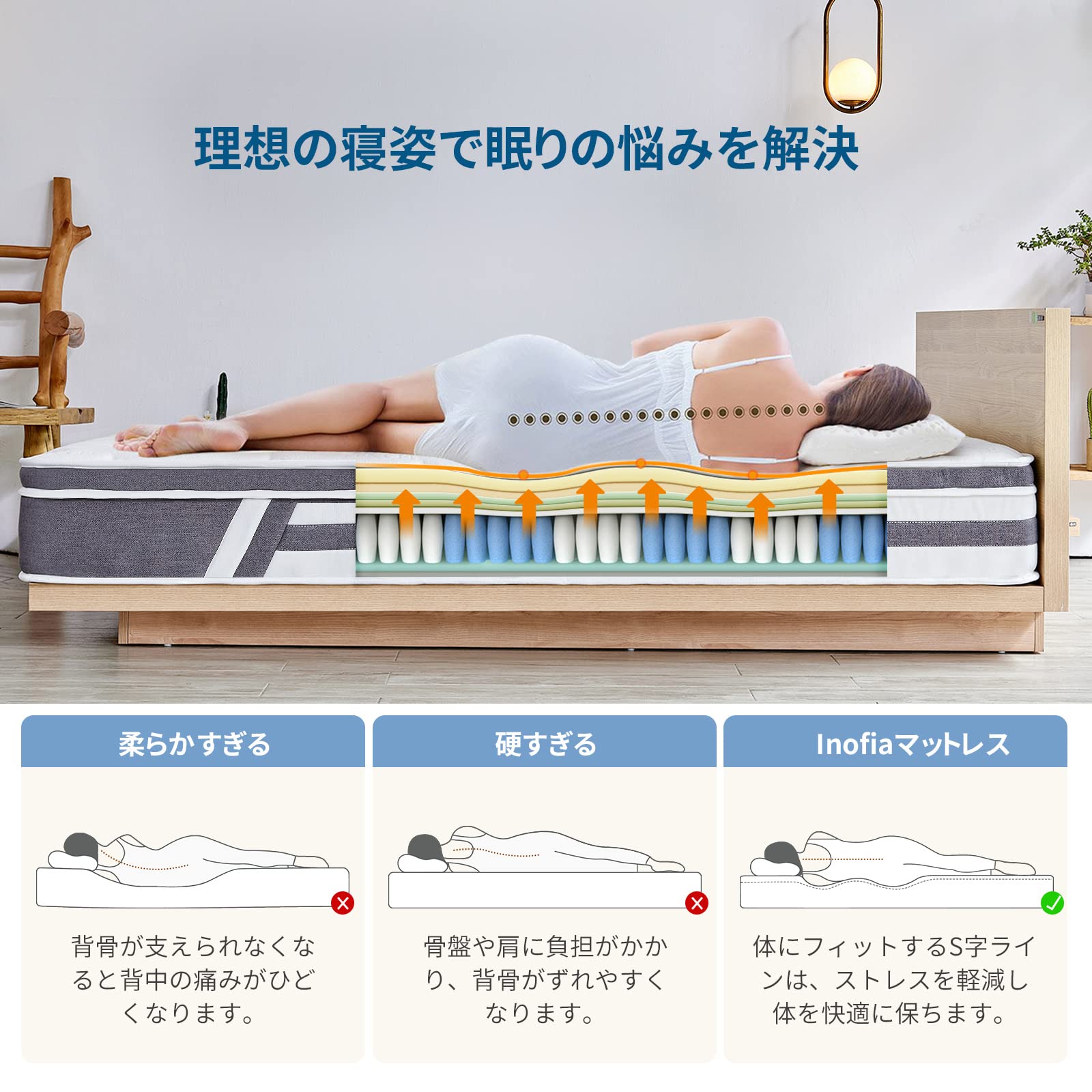 Inofiaマットレスは、できるだけお客様に最適な寝心地をお届けいたします。性別、身長または体重によって、人々の睡眠体験が異なります。マットレスが硬過ぎても、柔らか過ぎても、体に負担を与えるため、「適度な硬さ」は理想的です。