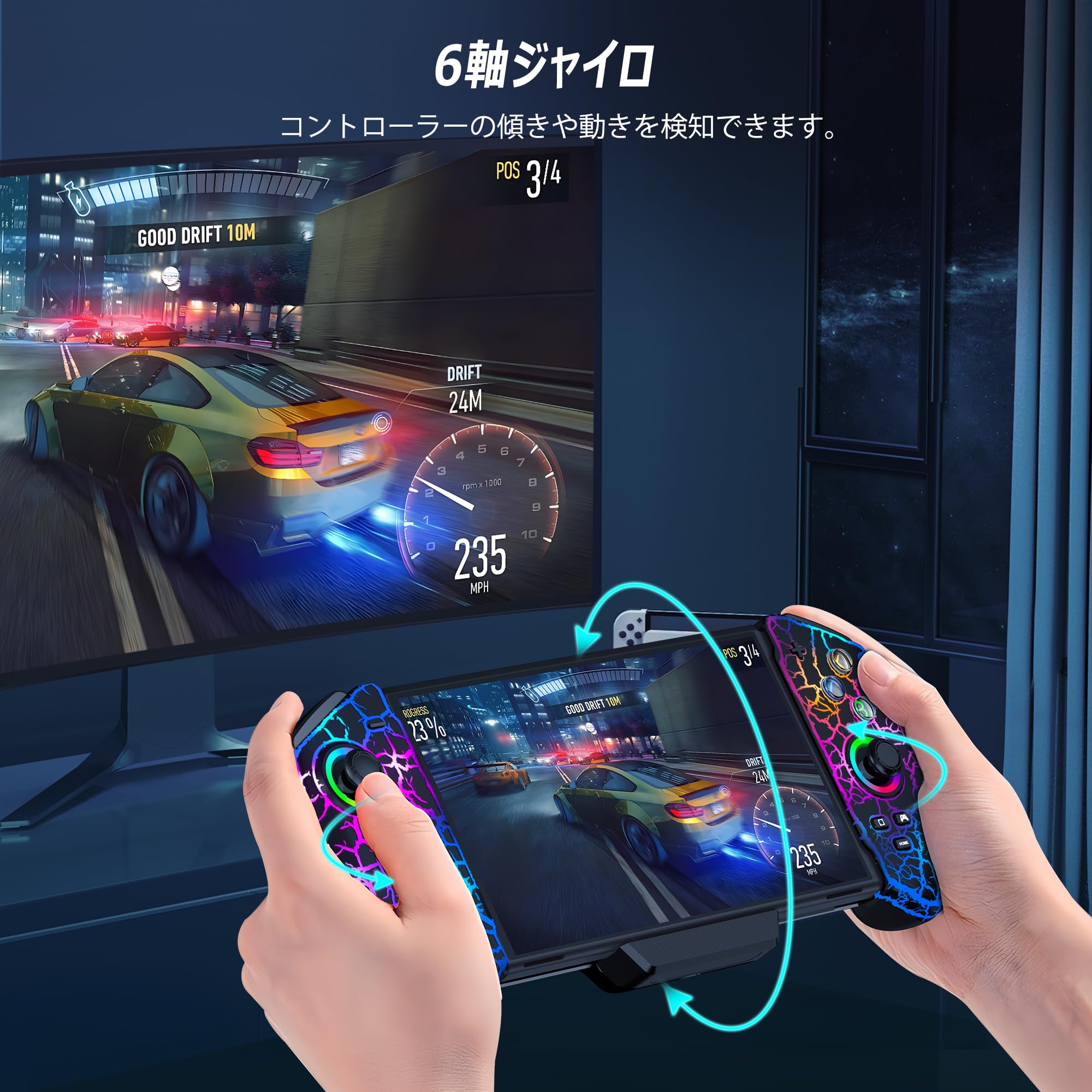スイッチ コントローラー 7色RGBライト 携帯モード専用コントローラー for Nintendo Switch グリップ コントローラージャイロセンサー 振動 連射 有線接続モード Switch/OLEDに対応 JC301