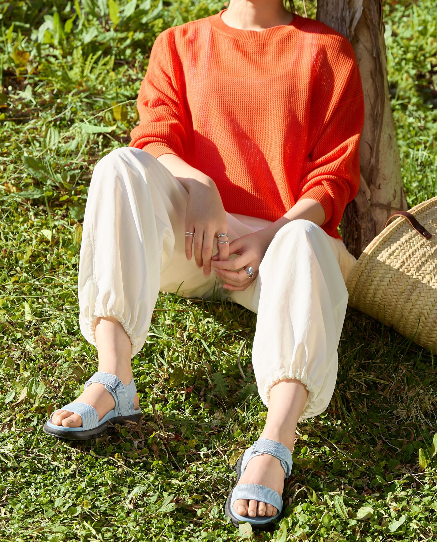 商品説明 この夏、サンダルタイプが初登場。カジュアルな印象のスポーツサンダルです。 地面と直接触れるアウトソールは履き心地にこだわったオリジナル。軽量&柔らかなつくりのため屈曲性が良く歩行の安定感を高めます。ラバー付きで滑りにくく、適度な弾性もあります。ニットで編み立てた甲のパーツが足を柔らかく包み込み、インソールもふかふかなのでソフトな履き心地です。インソールは表面に細かいシボ感のあるデザインを施すことでさらっとした着用感です。足首のテープでしっかりホールドされるので足がぶれずに疲れにくいのもうれしいポイント。 スポーティーなデザインですが、きれいめのカラーリングでワンピースやスカートと合わせるのもおすすめです。
