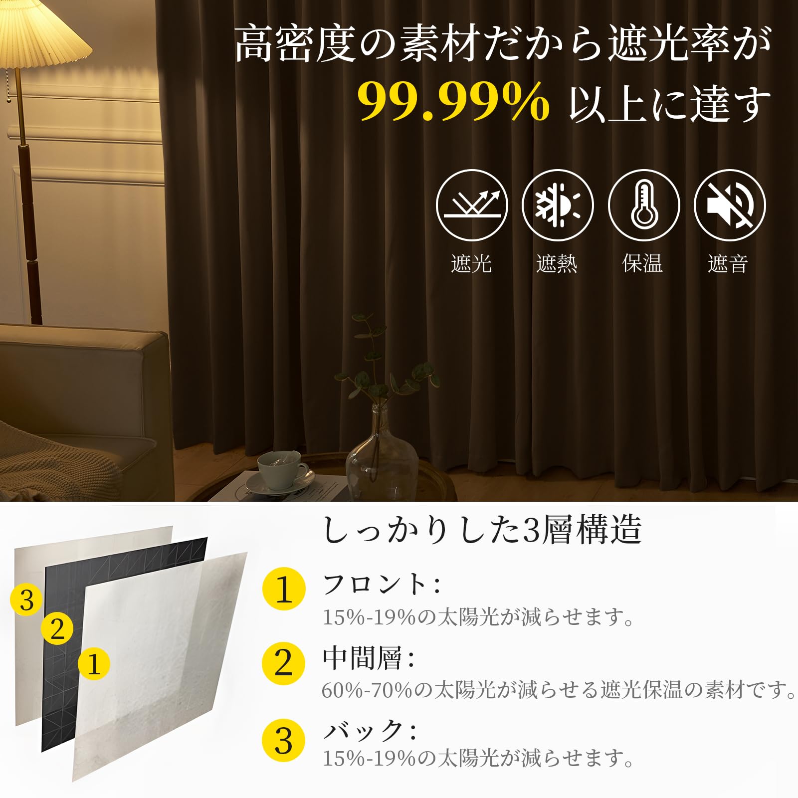 【3層構造・99.9%遮光】HEVUMYI遮光カーテンの生地は三重構造のテクノロジーの技術を使い、黒い系を織り込んでいるから、遮光率は99.9%に至ります。きちんと室外からの日差しや紫外線などをしっかり遮られ、日中に睡眠を取りたい人にお勧めします。 注意:色により光の吸収率が異なる為、同じ遮光カーテンであっても明るさが違います。薄い淡い色は光が通しやすく、濃い暗い色は光が通しにくいです。遮光性を重視する方は濃色をおすすめします。