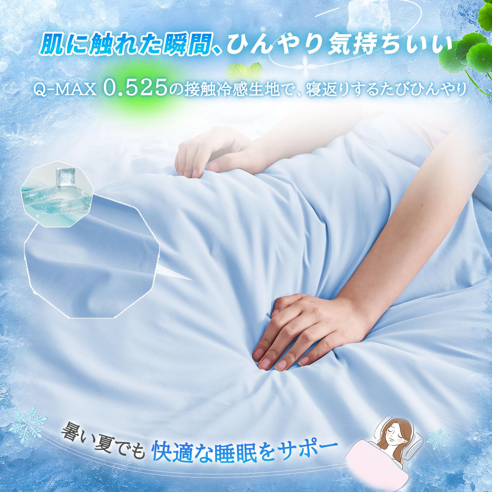 【両面素材で季節に応じて使い分け】布団カバーの表面は接触冷感生地(Q-max 0.525)で、体の熱を素早く拡散し、触れた瞬間にひんやり。裏面はふんわりパイル素材で、肌あたりが優しく、ほんのり暖か。冷感とあたたかさのバランスを自由に切り替えられます。