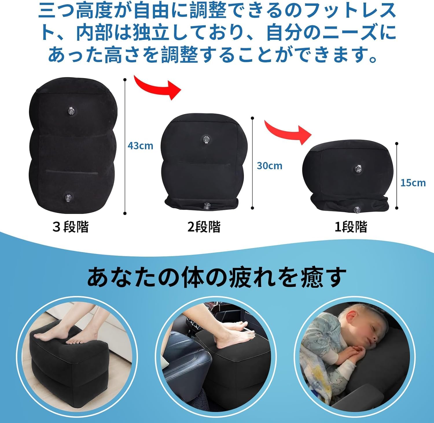 ✈【空気 フットレスト&高さ調節】弊社のフットレスト気弁は逆流防止弁付きの二重構造、一個三役足枕組み合わせので、 高さが違った三つ足枕、空気量を調整することによって、高さと硬さを調整可能です。 エアー式なので簡単な微調整で固さもお好みのままです。