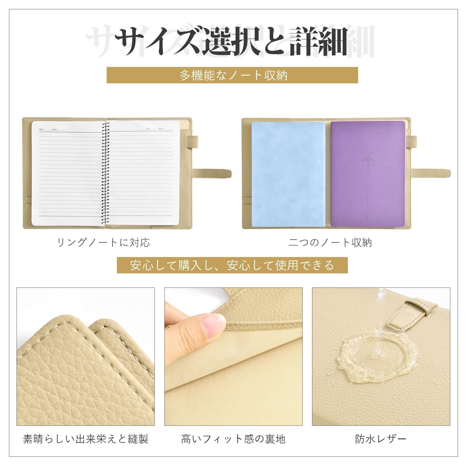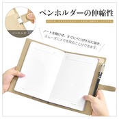 考え抜かれたデザイン:ペンホルダーにはゴム紐とつながっているため、いろんな太さのペンは差し込み、ゴム紐を引っ張って伸びたり、縮んたりしてペンを固定できます。(ペンはついておりません)。サイズは約22.7×17.1cmで、A5サイズのノートにぴったり収まります。差し込みタイプのベルトなので、ノートの厚さにより調節でき、しっかり固定できます。このノードカバーは、毎日の仕事と生活をより簡単でスムーズにします。