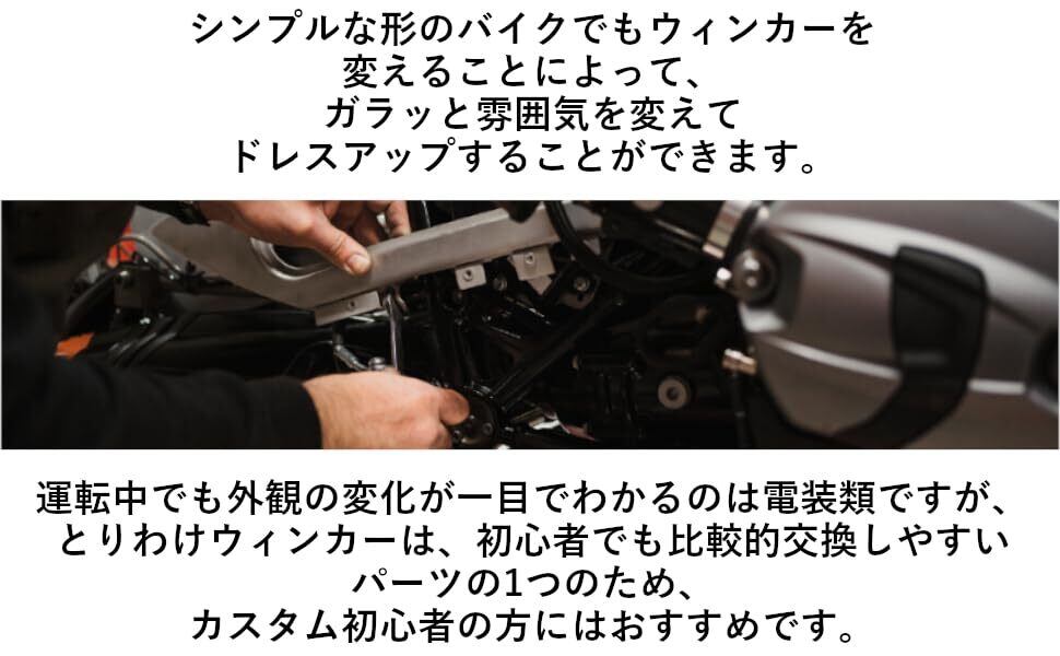 運転中でも、外観の変化が一目でわかるのは電装類ですが、とりわけウィンカーは、初心者でも比較的交換しやすいパーツの1つのため、カスタム初心者の方にはおすすめです。