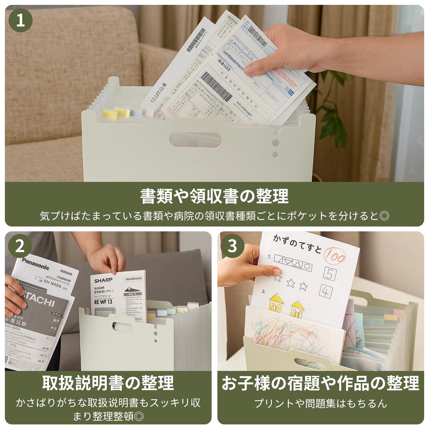 【幅広い用途】13ポケット拡張ファイルフォルダ、A4用紙約1000枚収納できます。資料、カード、通帳、伝票、封筒、領収書、プリント、書類、しおり等の分類整理に便利です。自宅、オフィス、学校、書斎など、さまざまな場所でファイルやメモを保管するのに最適です