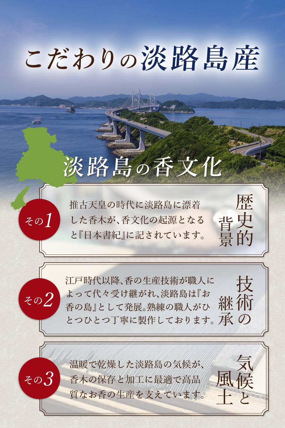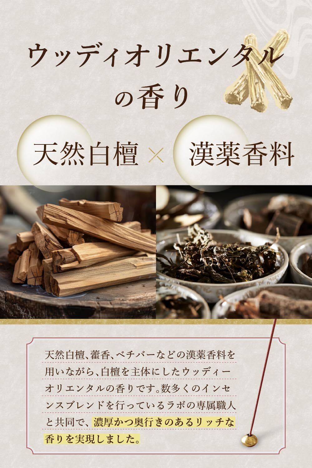 【白檀】白檀は香木系のお線香やフレグランス系の香のベースなど、最も香原料に使われている香木です。 ”古き良きお寺”を連想させる、名前を知らなくても一番知られている、お香の中でも親しみのある香りかもしれません。白檀の木で香るのは木の中心部分(心材)と根の部分だけ。伐採してから香りが立って熟成するまでに20年以上の長い年月がかかります。 毎日の暮らしの中に、香の「かおり」を取り入れてみませんか?