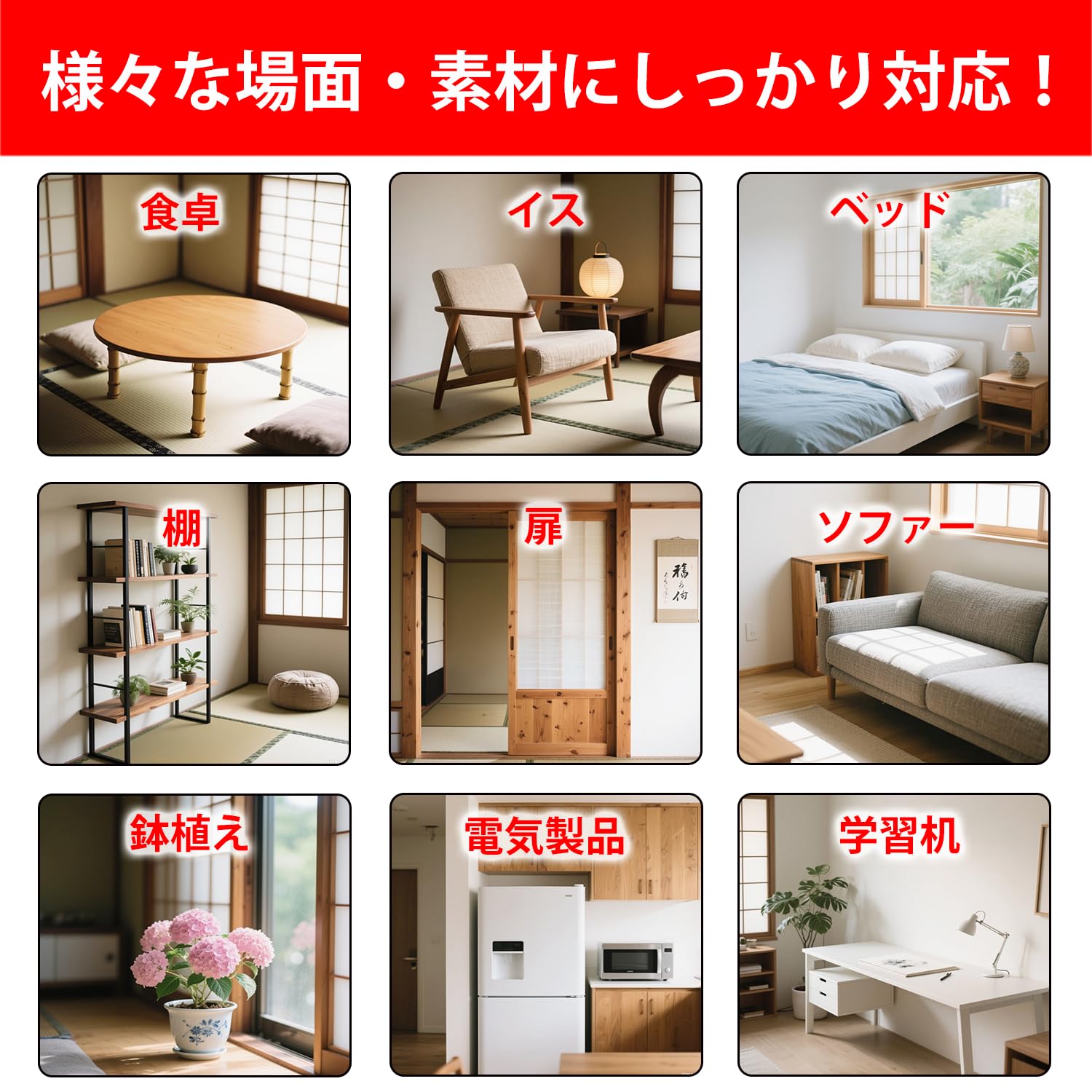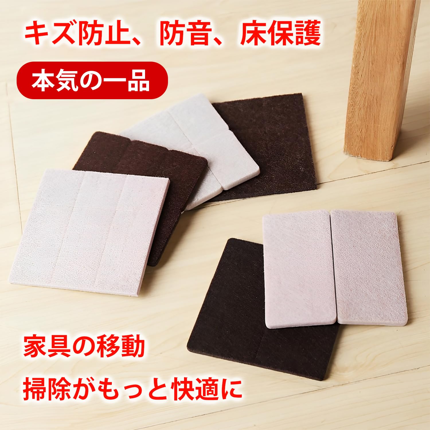 【幅広い用途&床材対応】家庭・オフィス・店舗など幅広く対応。テーブル、椅子、ソファ、ベッドの足の保護はもちろん、冷蔵庫や植木鉢、電子レンジなどの家電の底面にも使用可能。傷ぼうし フェルトとして、壁やドアの接触部にも適しています。フローリング・タイル・大理石・木材など様々な床材に対応し、衝撃吸収・防音・キズ防止に役立ちます。