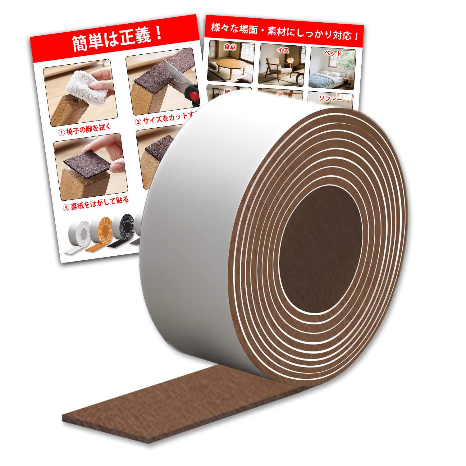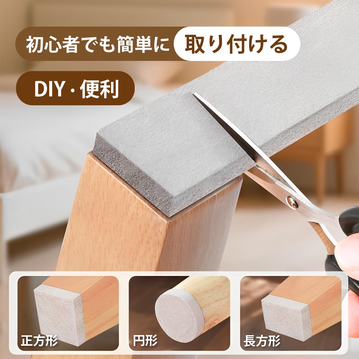 【自由にカット&簡単施工】ハサミやカッターでお好きなサイズにカットでき、丸脚・角脚・細長型など様々な家具に対応。椅子足カバーでは難しい形状にもフィットします。ベッドの足の保護にもおすすめで、必要な分だけ使えるため経済的。貼り付けは台紙を剥がして貼るだけ。工具不要で、誰でも簡単に設置できます。