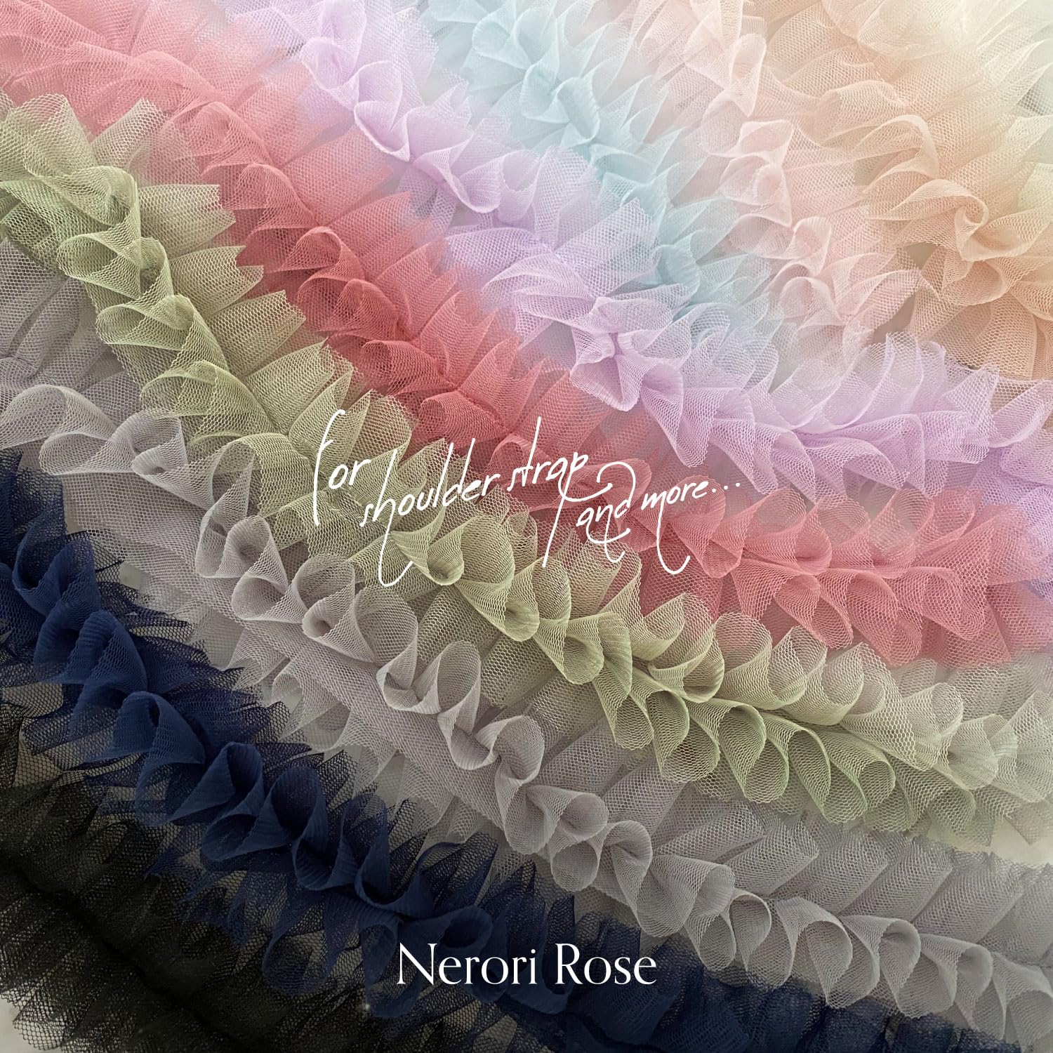 しなやかなチュールにタックを入れボリューム感を持たせた、フリルが可愛いフリルチュールテープです。