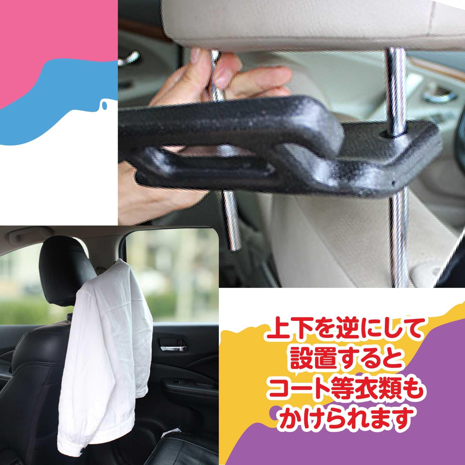 【便利な後部座席乗降補助】後部座席の乗り降りを手助けする手すりフック。運転席側と助手席側に設置できる便利な2個セットと、単品1個が選べます。簡単取付で工事不要、3種類のポールサイズに対応。掴みやすい滑り止めグリップで、荷物かけやハンガーとしても使用可能。素材はABS樹脂、単体重量約150g。