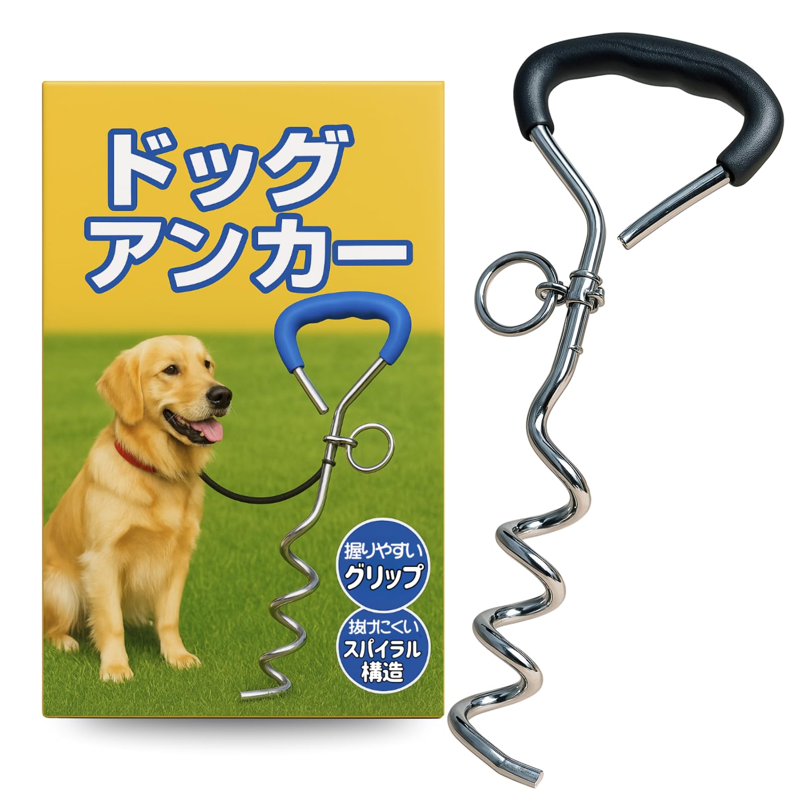 ポールも木もない広場やキャンプサイトで「リードを結ぶ先がない」「絡まって動きが制限される」——そんな悩みを解決するのが本製品。スパイラル形状で地面にしっかり食い込み、ヘッドは360°回転。愛犬が伸び伸び動ける自由度を確保できます。