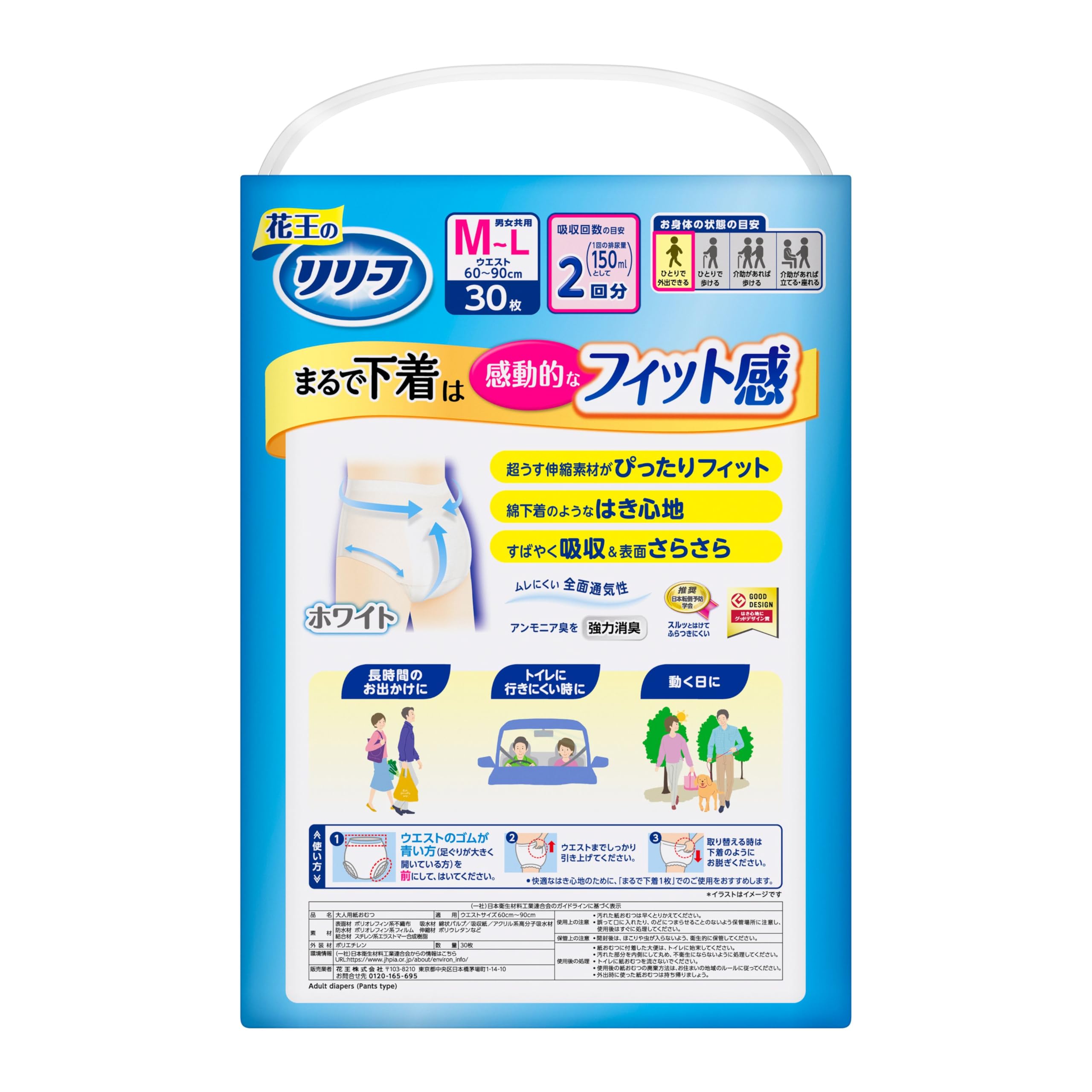 花王リリーフまるで下着の3つのこだわり1超うす型で綿下着のようなはき心地!ゴワゴワしない、やわらかな肌ざわり2後ろ姿すっきり!しなやかフィットで、お尻まわりも、もたつかない3お出かけにも安心!すばやく吸収&消臭。安心の2回分吸収ムレにくい全面通気性。アンモニア臭を強力消臭。ホワイト。(医療費控除対象品)