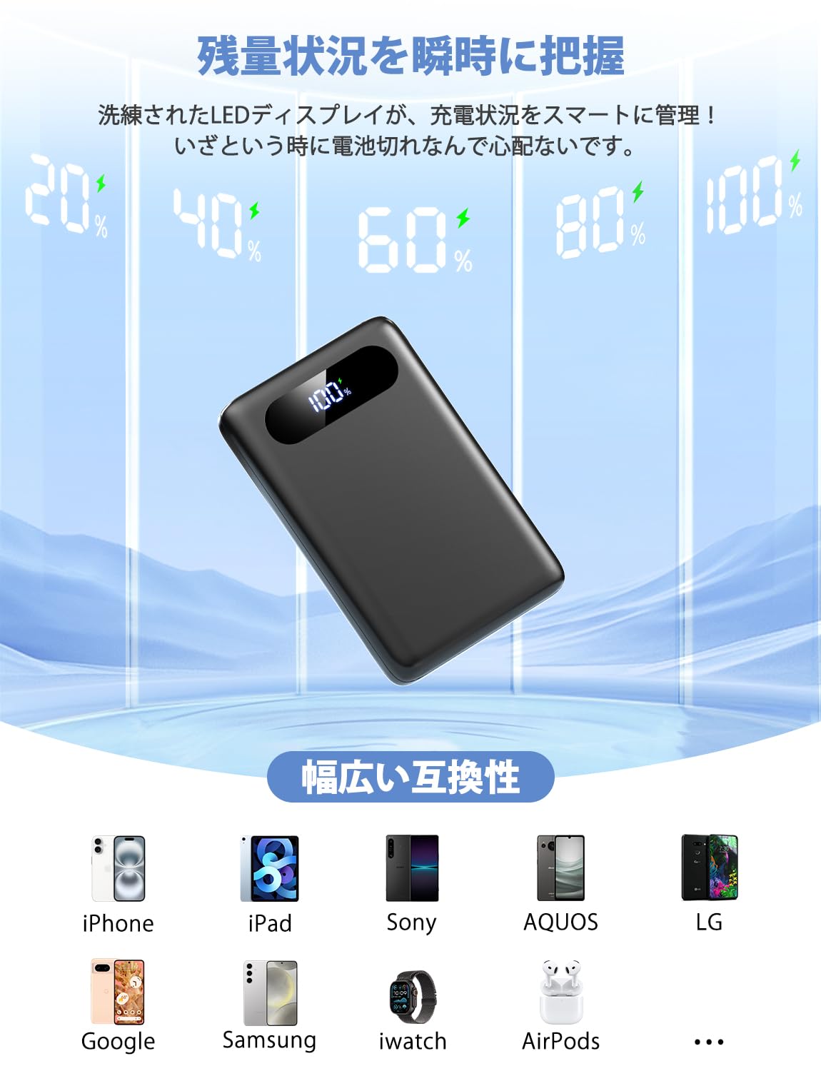 【一目で分かるLED残量確認ディスプレイ表示・簡単押すの電源ボタン】従来のバッテリーは残量が大まかな丸のような点灯式で表示方式とは違い、弊社は一目で残量が分かる数字式を採用しています。充電のタイミングを把握する上で便利、使うときにバッテリーの残量が無いといった不安を解消します。また、今回は低電流モードも加えていて、電源ボタン連続二回押すと、モード替えて、Bluetooth イヤホンかスマートウォッチのような低電流製品に充電したい時に、製品に壊れるか心配も解消するできます。さらに、現在モテるなタッチ式ボタンとは違い押すタイプのボタンをデザインしました。押すタイプのボタンとはいつでもどこでも、一回押すだけで残量も分かるし、手の清潔さも不要で、位置もわかりやすいので、操作便利です。
