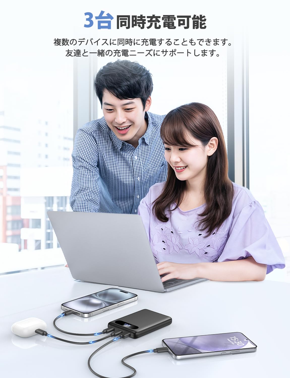 【5V/3A急速充電&最大3台同時充電可能】突然電量不足で長い充電時間待つのは嫌な方と考え、弊社の「N4」は急速充電ポート(Type-C)で僅か30分間で電量0%のスマホに50%が充電でき、充電時間が大幅にが縮めることができます。一台だけで、出張中や旅行中にもコンセント不要で、十分充電できます。携帯充電器 20000mahとしても非常に便利です。【双方向充電できるType-Cポート&Smart IC搭載】充電と給電を同時にできるType-Cポートにより、スマートフォンの充電だけでなく、バッテリー本体の充電も対応可能できます。また、Smart ICという技術が搭載されて、自動で接続機器に最適な電圧電流値を調節して充電し、充電時間を縮めになり、快適なデジタルライフを楽しめます!(パススールではありませんので、ご了承ください)さらに、モバイルバッテリー ケーブル内蔵としての利便性も兼ね備えています。