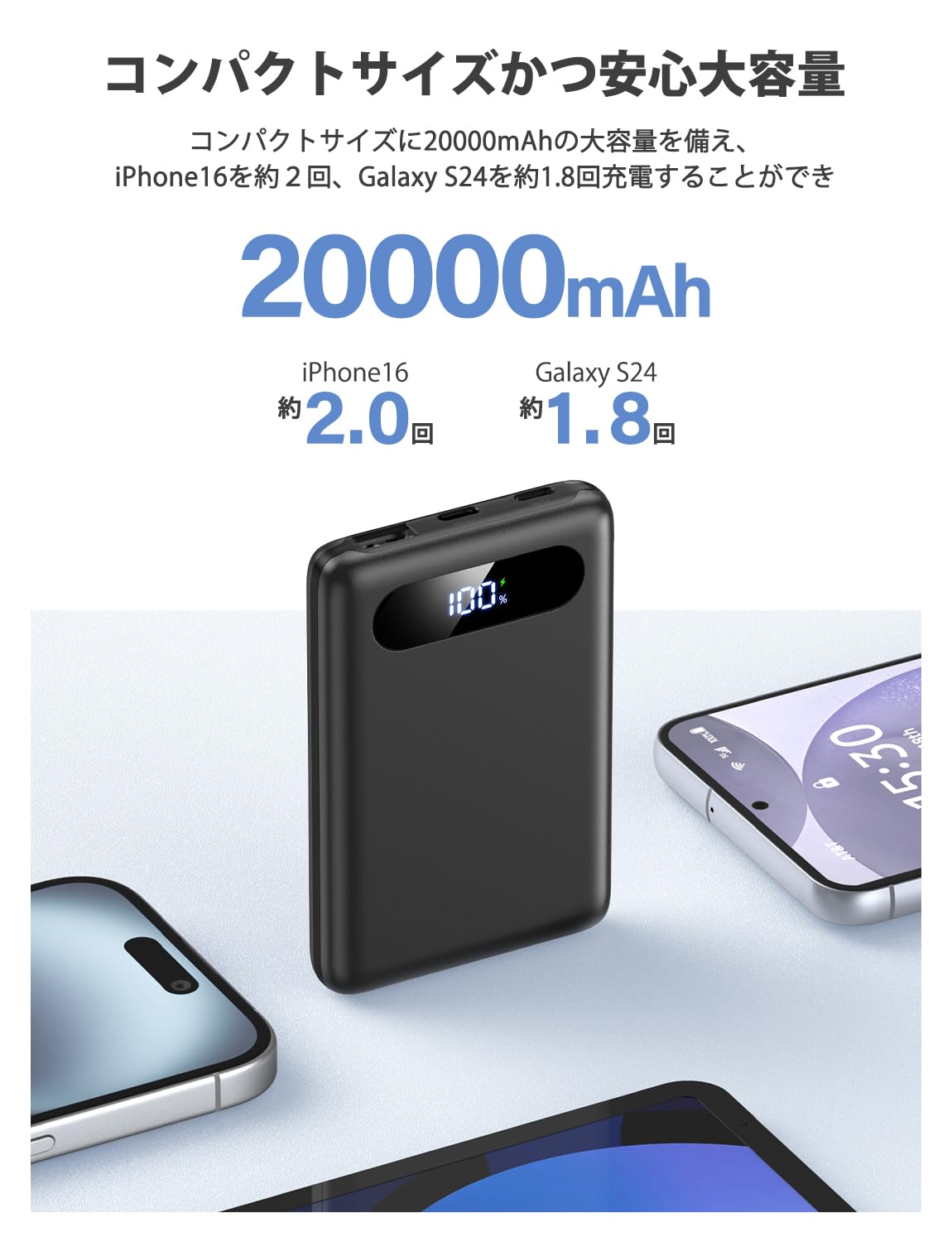 モバイルバッテリー 軽量 【20000mAh大容量・薄型・最大3台同時充電可能】 小型 最大30W急速充電 LED残量表示 スマホ充電器 携帯充電器 iPad/iPhone/Android各種スマホ対応 PSE認証済み&安全回路保護 機内持ち込み可能 旅行/出張/アウトドア/キャンプ/停電対策/防災 日本語取扱説明書