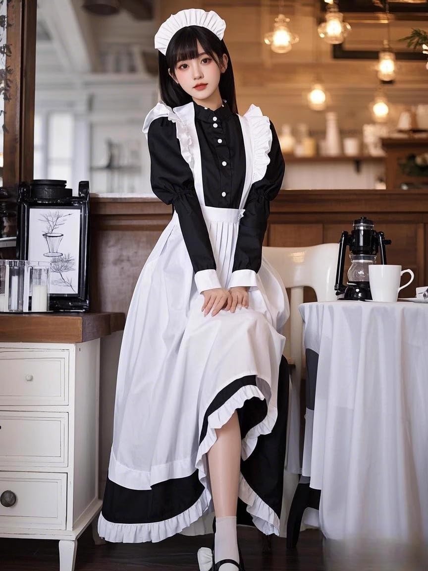 【デザイン】英国風調の落ち着いたデザインのメイド服です、黒と白のカラーリングがシックで上品な雰囲気を醸し出しており、フリルのついたエプロン、王道の黒×白カラーで本格的で上品なメイドさんになりきりロリータスタイルを愛する方にぴったりです。男性の方でも着用できるデザインなので、カップルやペアで楽しむことも可能です。
