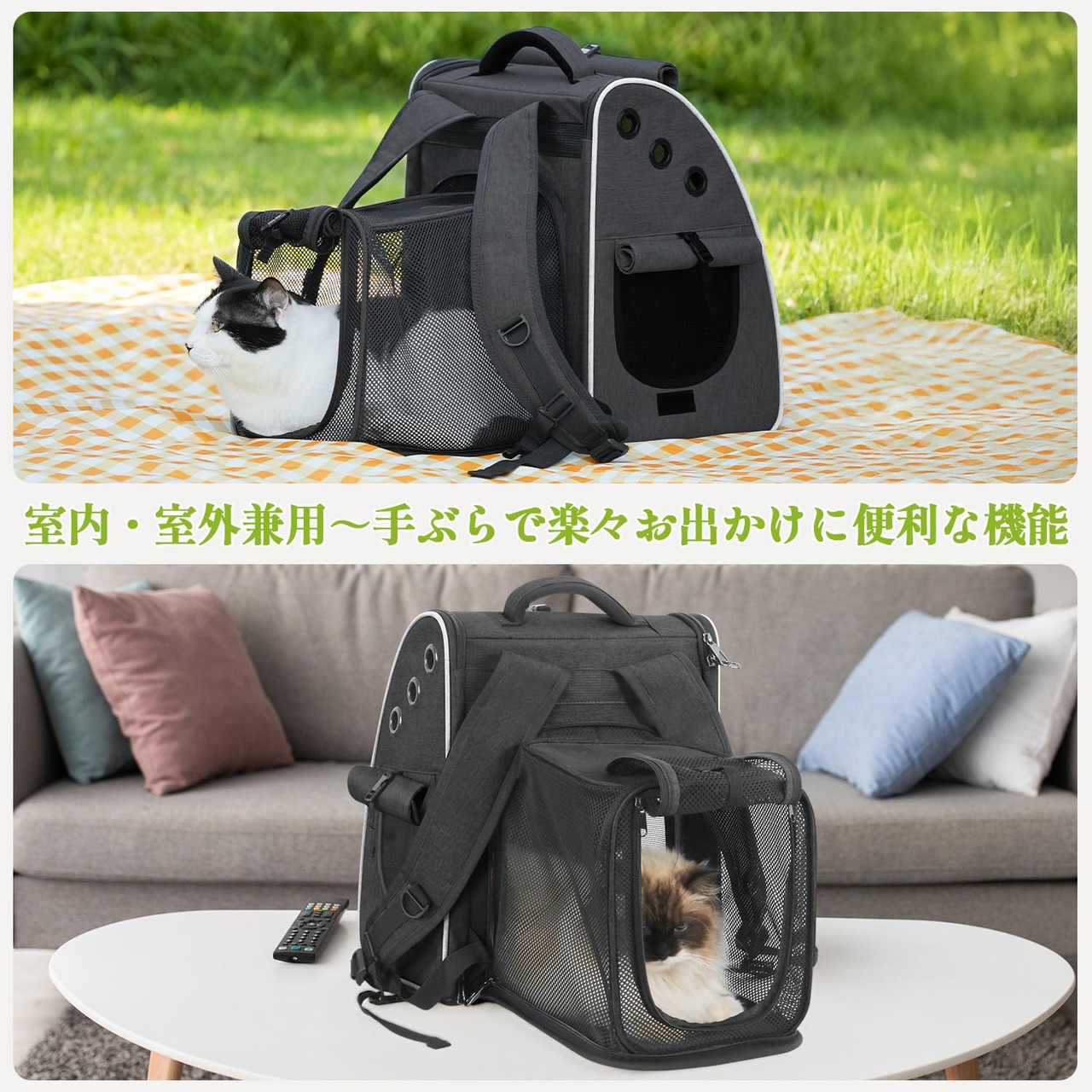 【ハウス型猫 リュック・大空間】普通の手提げ・リュックだけでなく、ペットハウスとしても使えます、ペット リュックの後部を開けて、更に多くの空間を拡張し、メッシュなので通気性も良い、ペットがバッグの中でのんびりに過ごせます。ペット リュック キャリーの正面と両側が開けます、ペットの出し入れも簡単!