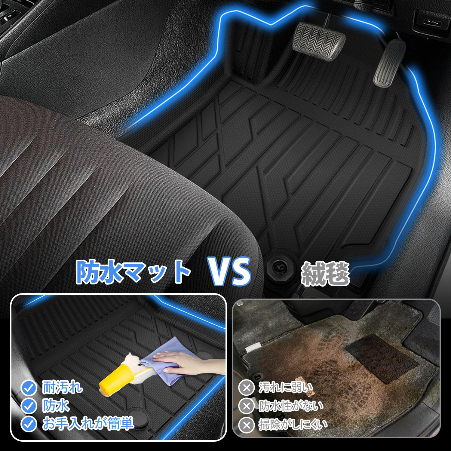 【車種専用設計でピッタリフィット】■車種専用設計、マットのズレ防止。運転席は純正ストッパーに対応するホール付きます。■アクセルペダルとブレーキペダルに干渉しません。■座席のスライドレールに干渉しません。抜群フィッティングします。こだわり車種専用設計のため、車内に隙間なくフィットします。