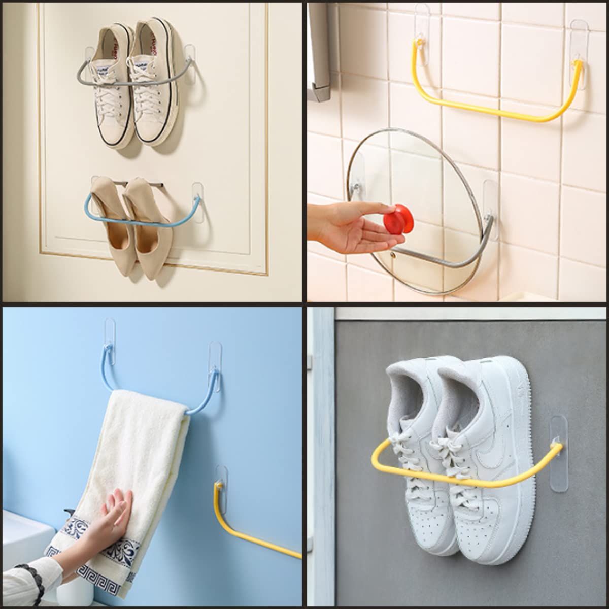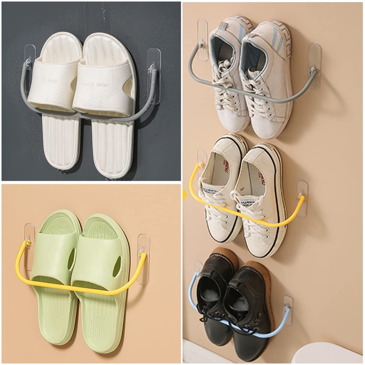 取付も簡単:この壁掛けスリッパラックは取り付けが簡単で、両面テープが付属しており、追加の工具は必要ありません。壁やドアなどの滑らかな表面をきれいにして乾かし、両面テープのフィルムをはがして貼り付けるだけです。よりしっかりと貼り付けるために、24時間待ってからご使用ください。