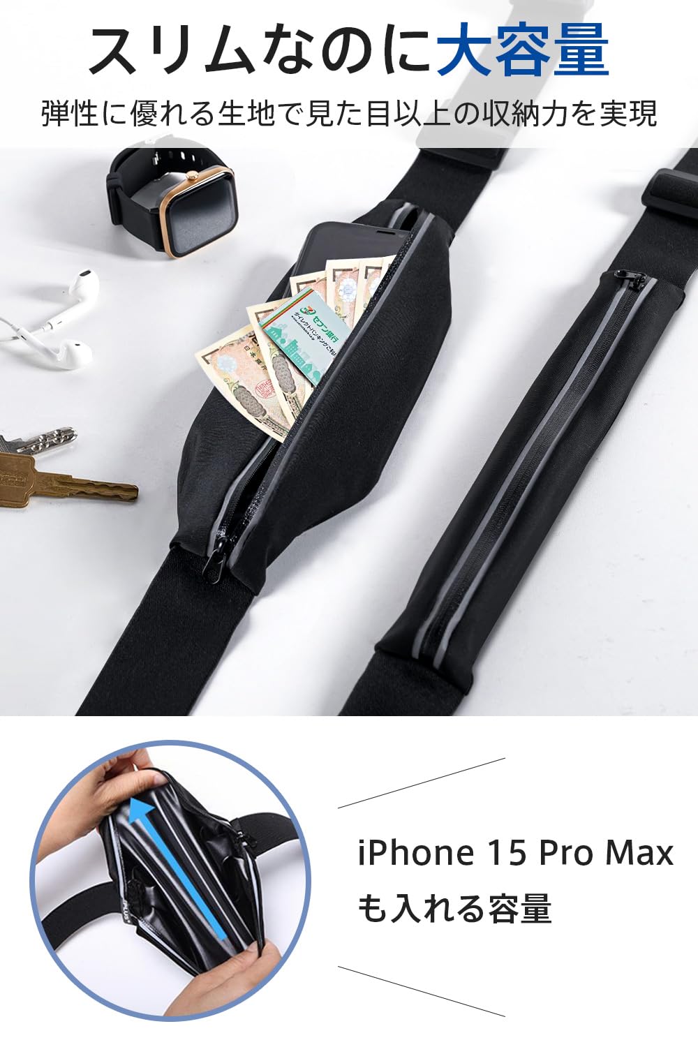 【新設計 · 超軽量】 ランニング ポーチ 揺れない 超薄型 大容量 防水 伸縮 光反射材付き イヤホンホール付き 男女兼用 キー/カード/小銭入れ ウエストポーチ ウォーキング/ジョギング/マラソン/遠足 登山用 iPhone&Androidスマホ対応 (Black)