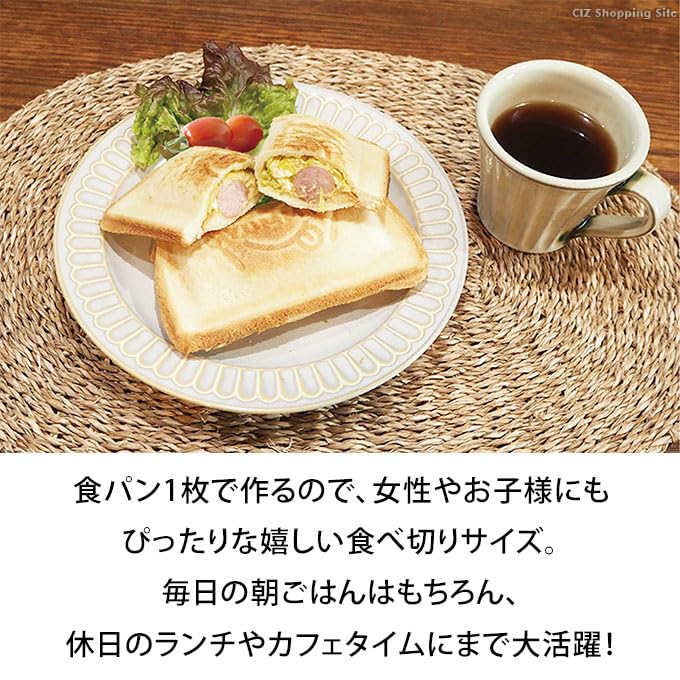 朝はパン派のみなさーん!こんなことありませんか?「トーストもいいけど、正直飽きた。」「子どもの朝食やおやつマンネリ化してきた。」「お家で手軽にカフェ気分を味わえたら、いいのになぁ。」…そんな、あなたの希望を叶えてくれるのが、こちら、ホットサンドメーカー!食パン1枚とお好みの具を挟んだら、ホカホカのおいしいホットサンドの出来上がり1枚で作るから、1人で食べるのに丁度いいサイズ!おかず系のホットサンドやデザート系のホットサンドなど、具材を変えればアレンジは無限大朝、美味しいコーヒーを淹れてホットサンドを食べる生活…ステキじゃないですか?その夢、叶いますよ。このホットサンドメーカーで。