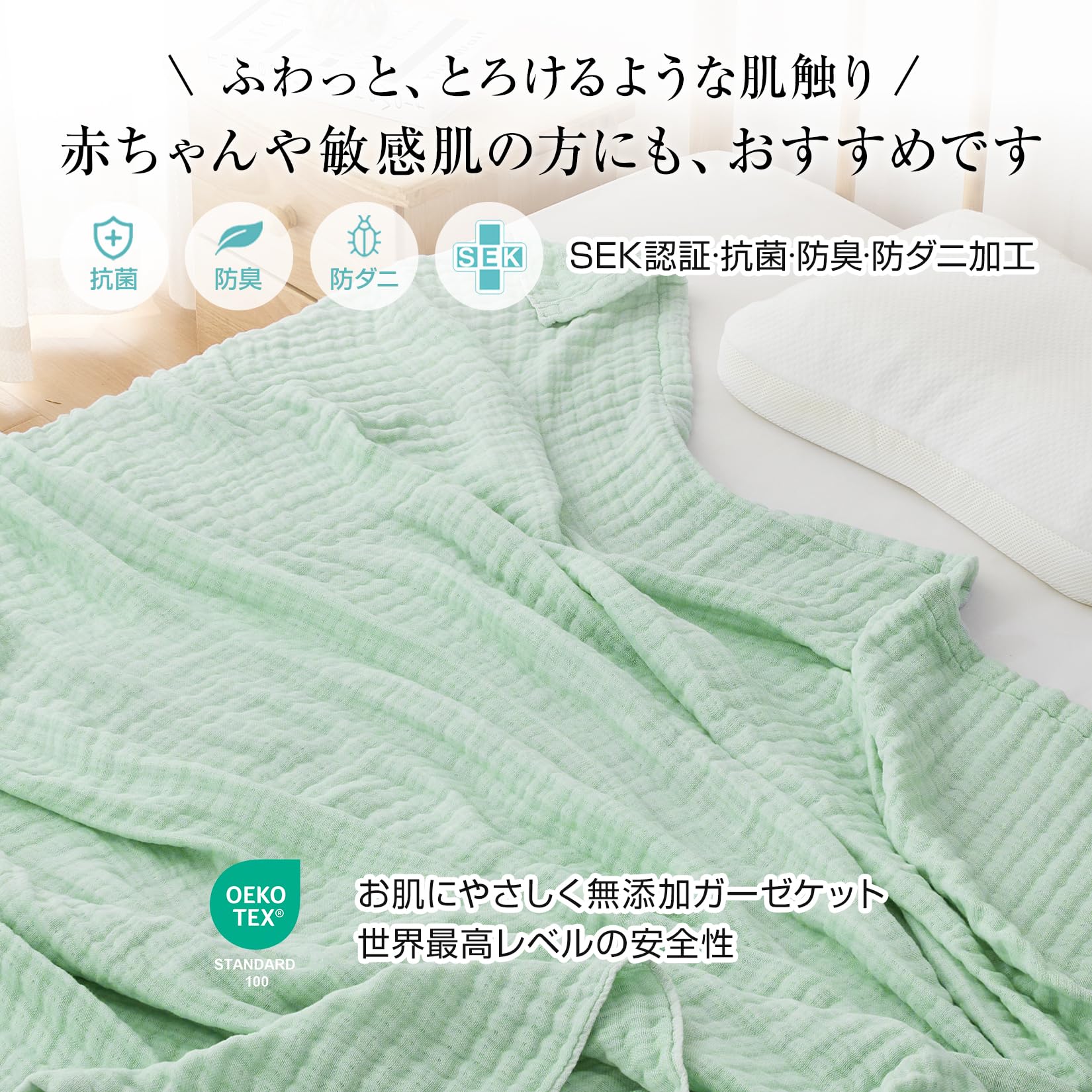 fuwawa ガーゼケット ダブル 6重織り 天然綿100% 吸湿 通気 綿 お昼寝ケット 肌掛け やわらか 夏快眠 肌に優しい 年中快適 丸洗いOK 抗菌・防臭・防ダニ 洗える 軽量 リバーシブル 冷房対策 ガーゼけっと 180x200cm (無地グリーン)