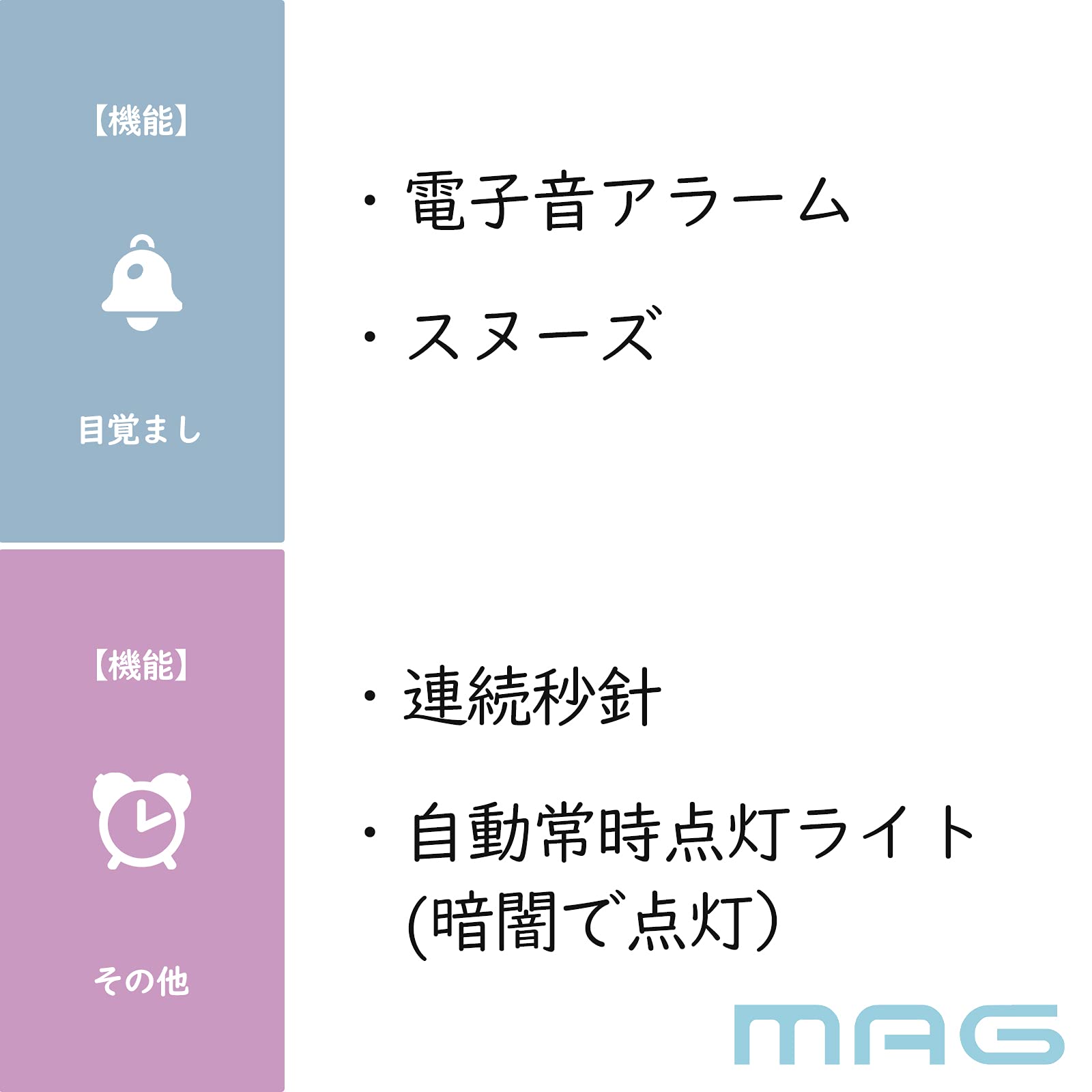 機能:電子音アラーム、スヌーズ機能、ライト、自動点灯機能 (光センサー式)、連続秒針