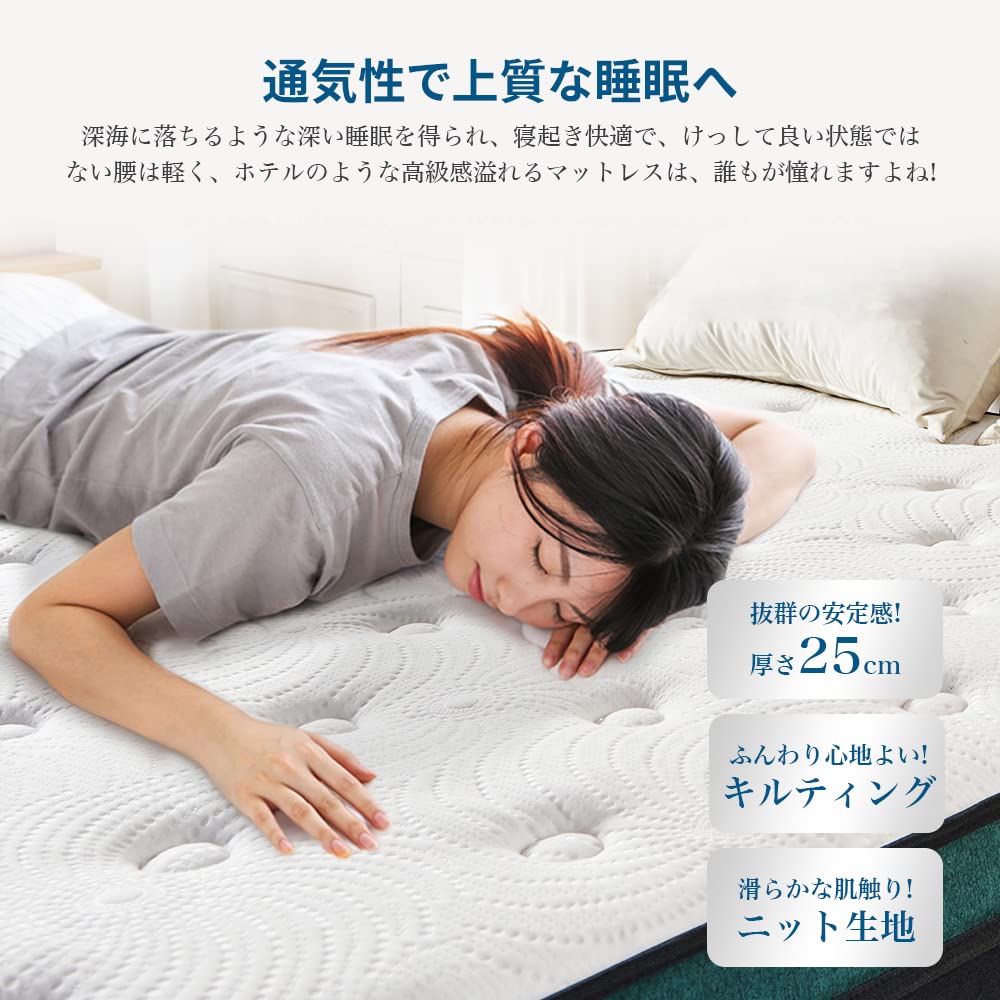 【厚さ25cm、理想のな寝心地へ】「Inofia」マットレスの厚さが25cmで、上質な素材を選び、柔らかく、通気性が良く、サラッとした肌触りです。さらに、独立したポケットコイルスプリングが身体をしっかり支えています。「純」高反発マットレスがしっかり支えて腰にリラックスしてくれます。生地のツッパリ感をおさえ包み込む様な優しい寝心地を実現しております。