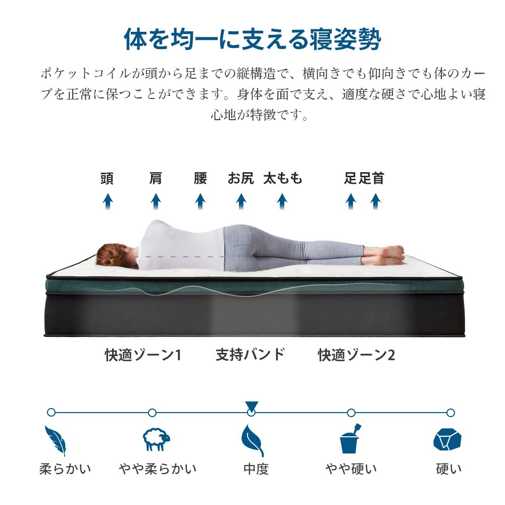 【安心で上質な素材とデザイン】マットレスは安全でユニークなデザインと素材を選んでおり、肌と接触して悪い化学反応が発生しません。「外側の2層構造のウレタントッパー」はキルティングしたものを張り込んでおりふんわり、サラッとした肌触りです。「ゴムフリー綿Xオーガニックコットン」で高級なマットレスの材料としてよく使われます。人体に柔らかくて、通気性と保温性がよいです。さらにポケットコイルは並行配列で体をしっかりサポートしてくれます。ハイテクと環境保護のマットレスは体へのフィット感を保証します。
