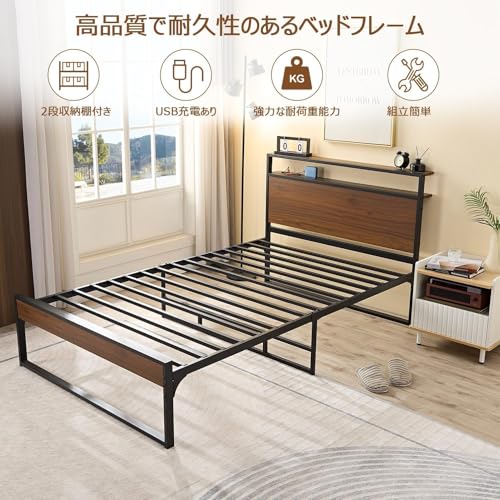 VECELO ベッドフレーム セミダブル 2口コンセント付き スチールベッド 宮棚付き パイプ シングルベッド 防錆 頑丈 安定性 耐久性 耐荷重340KG 組立簡単 スチールベッドフレーム (幅120x奥行195x高さ95cm ブラック&ウォルナットブラウン)