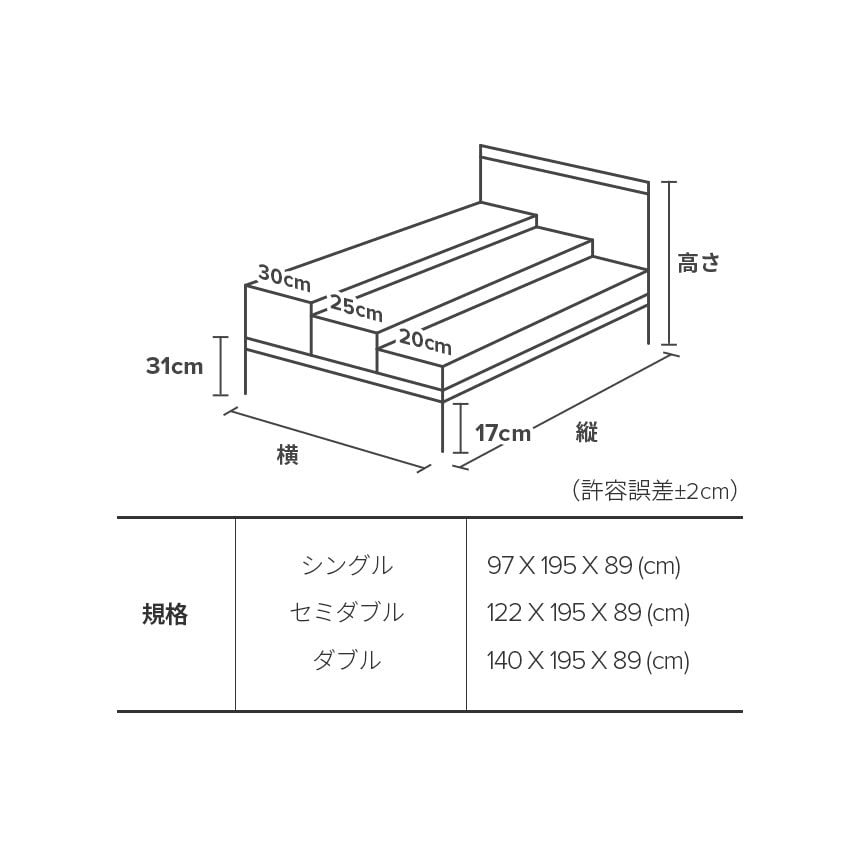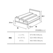 ※フレームのみ、マットレスは付いておりません。寸法:ベッドフレームのみ:195x97x31cm、ヘッドボードを含む場合:196.5x103x89cm