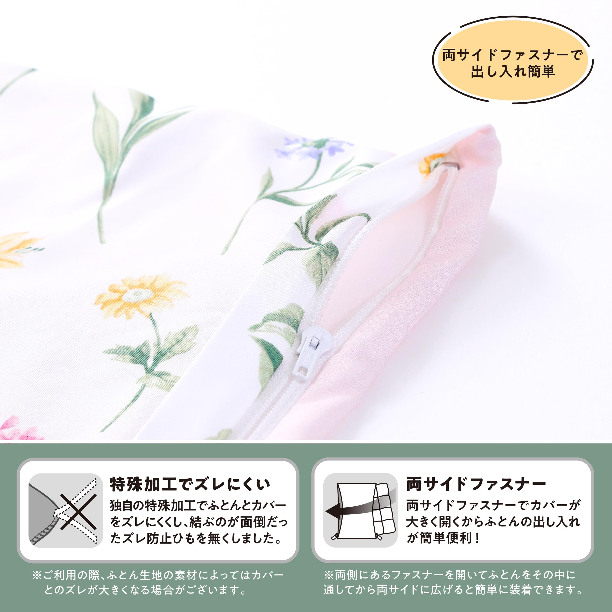 ◆カバーの両サイドにファスナー付き。端から端まで大きく開いてカバーの出し入れも簡単便利。洗濯時の付け替えもラクラク。日々の時短にもつながります。