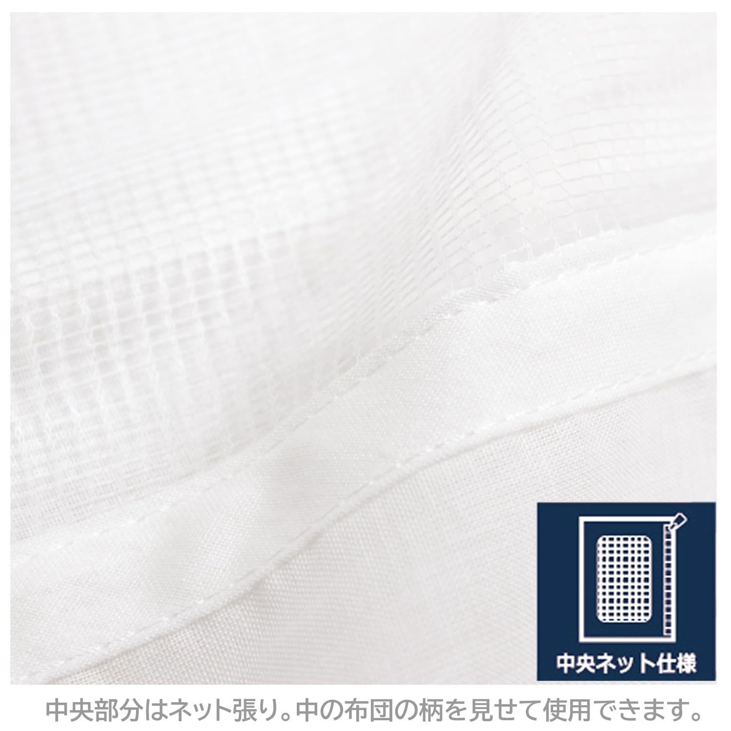 綿100%素材で吸湿性・吸水性に優れ、年間を通してお使いいただける布団カバー。中央部分がネット張りで布団の柄が見えるタイプ。