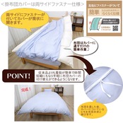 両サイドに全開ファスナーが付いて布団の出し入れが簡単になった掛布団カバー。布団カバーで面倒な「布団へのセット」が簡単になりました。カバーは筒状に開くので布団を通して各ヒモを留めるだけ。従来品よりも着脱が簡単で時間短縮にもなります。また洗濯後、両サイドを開いて乾かせば さらに乾きやすくもなります。素材は綿100%で肌触りが良く吸水性に優れてオールシーズン使用できます。