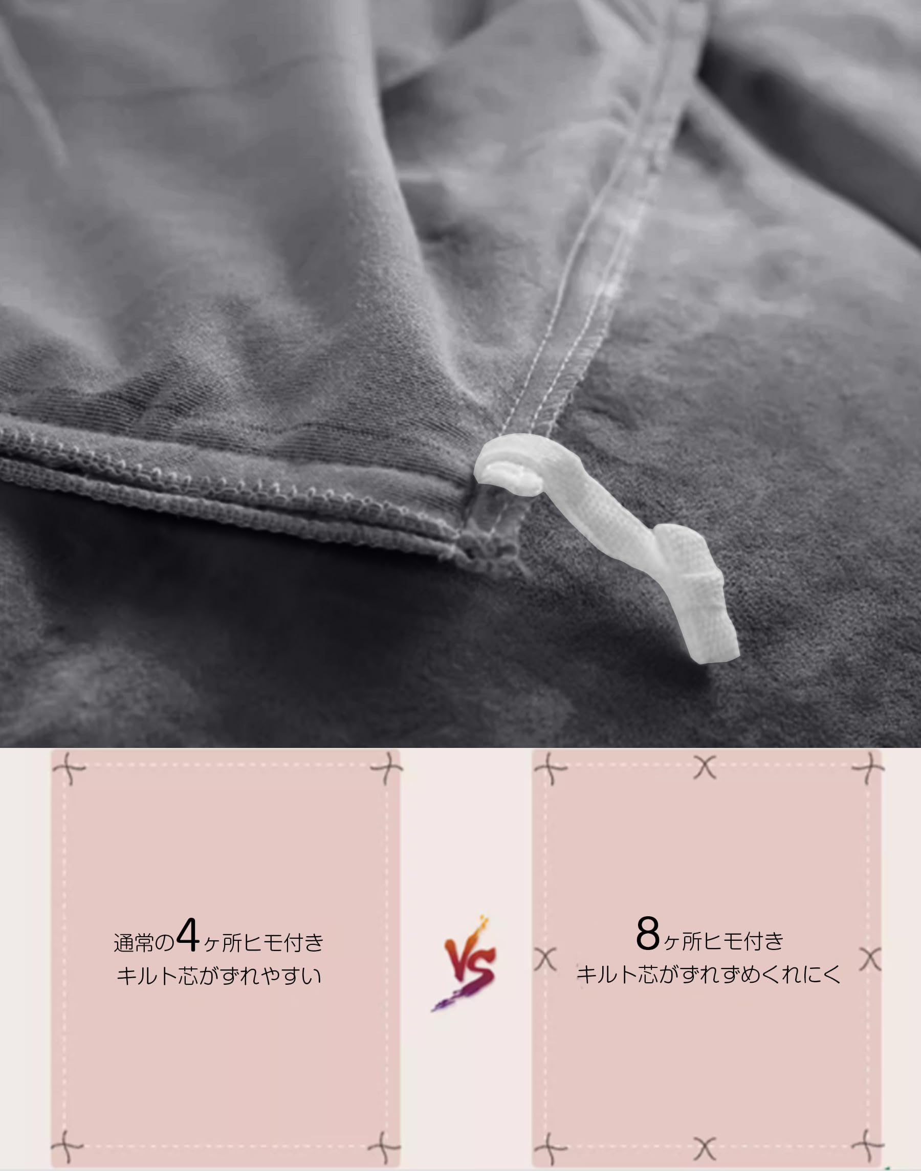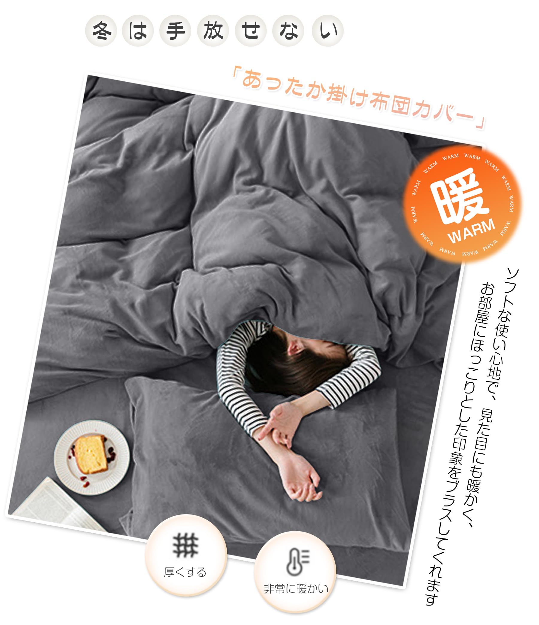 【あったか布団カバー 暖かさが格段にアップ! 】 ミルクベルベットの魅力は、高い保温性と雲の上に寝ているような柔らかな肌触りの良さにあります。 暖かいため、寒い冬には欠かせない生地ともなります。 マイクロファイバー生地を使用しているので、入った瞬間から毛布1枚の暖かさを感じることができます。 繊維の間に空気を溜め込み、体温を逃がさず暖かさを保ちます。 一番大切なのは、寒い季節に布団をかぶったときの「ひんやり感」がなくなることで、体にぴったりフィットし、首肩の部分も隙間ができないので保温性が高いです。 幸せな気分になれる柔らかな肌触りが人気です。 保温効果もあり、寒い季節には欠かせないアイテムです。