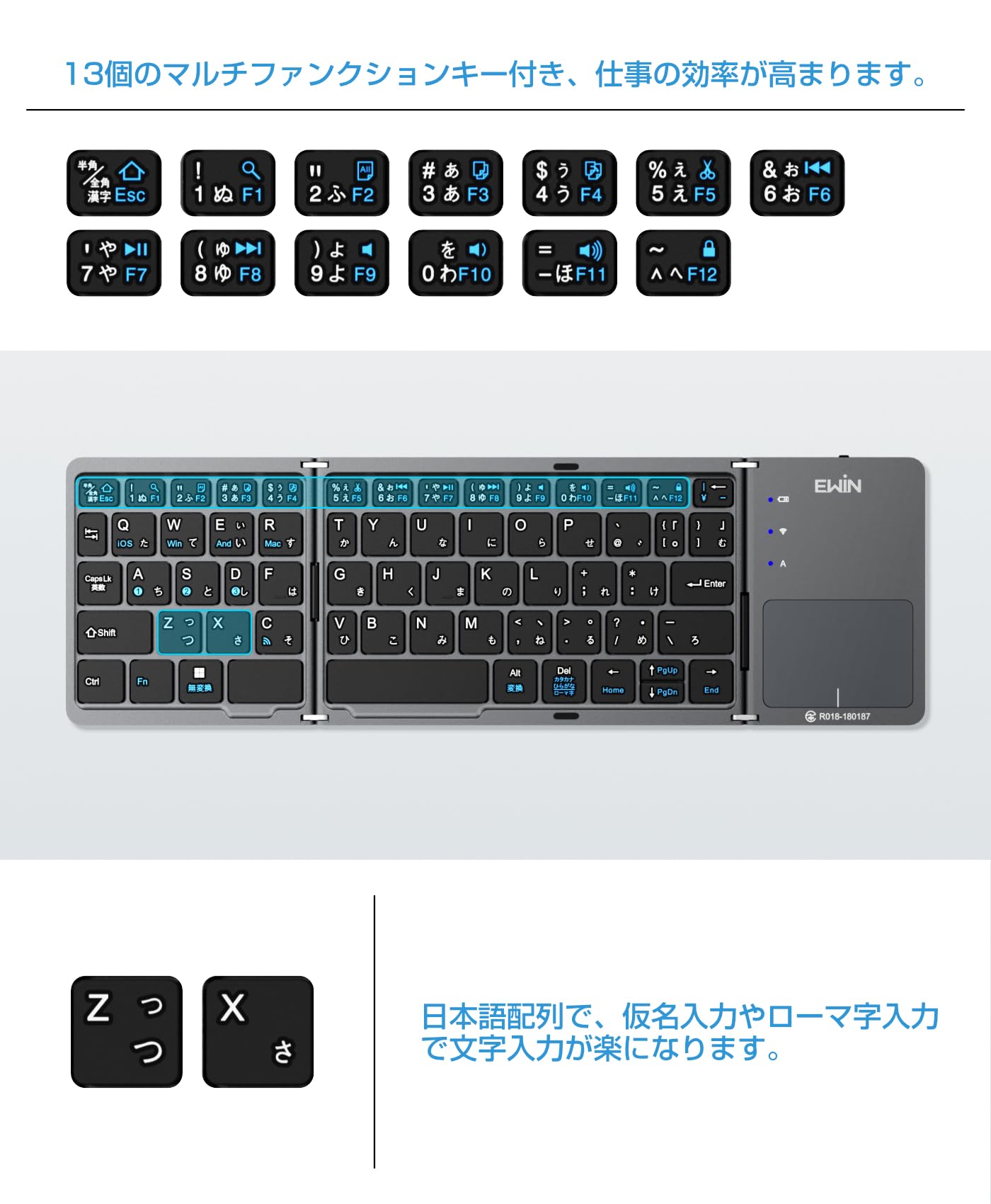 Ewin キーボード bluetooth 折りたたみ ワイヤレス タッチパッド付き keyboard 無線 日本語配列 ブルートゥース ios Android mac Windows対応 3台までのデバイスと接続可能 ipad iphone用 コンパクト 薄型 軽量 タブレット スマホ パソコン用 Type-C充電 スタンド付 グレー