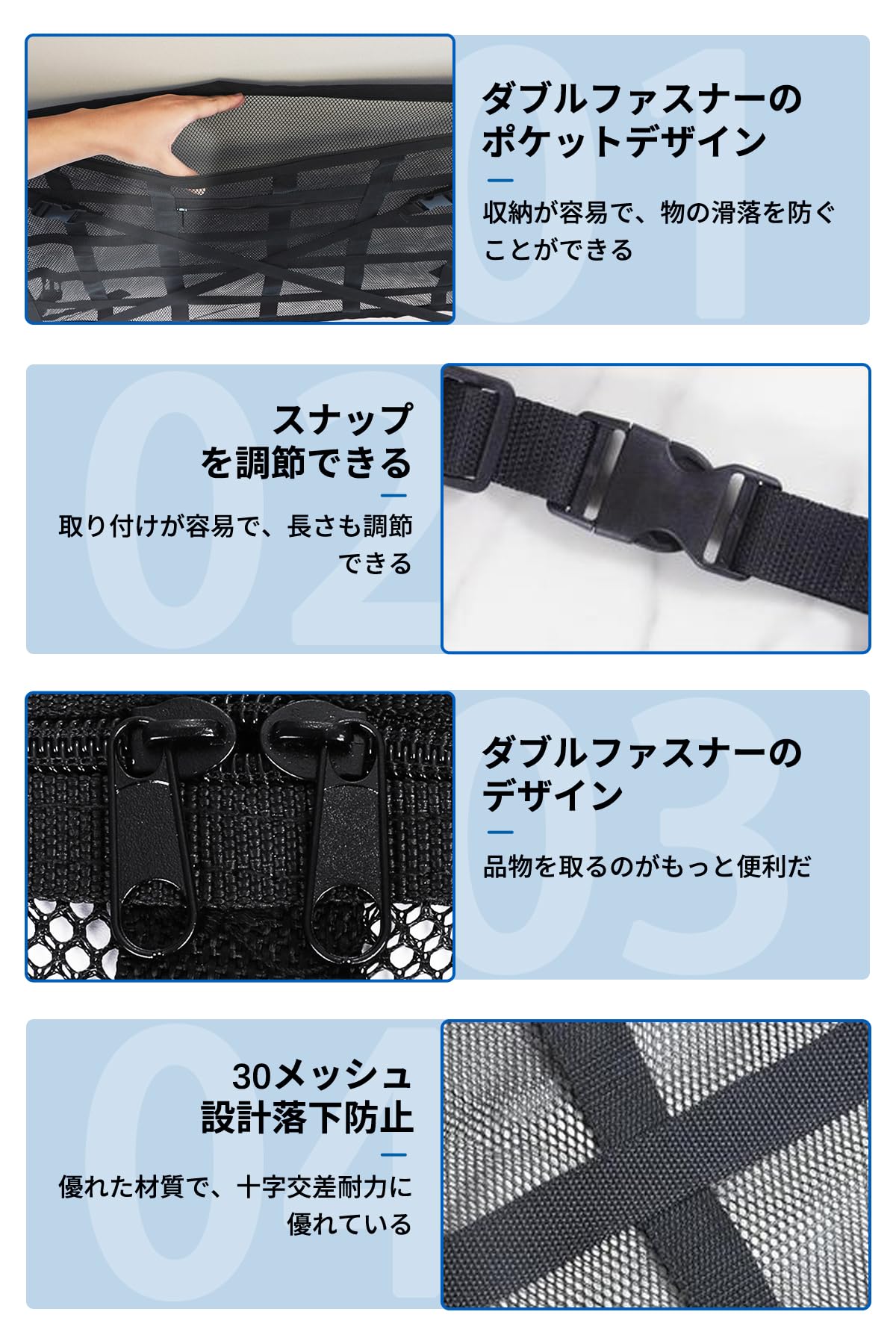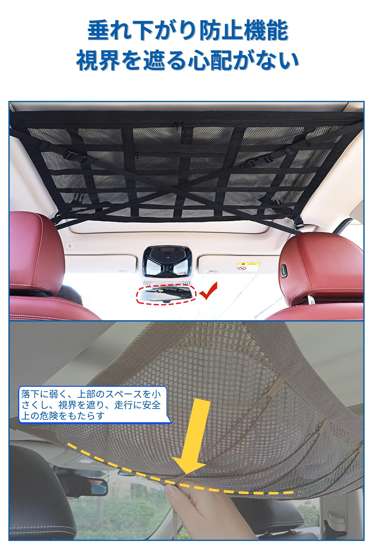 COBIVI 車収納 天井 車内天井収納 ラゲッジネット 荷物固定ネット ルーフボックス カーゴネット 2層タイプ 車内収納 ルーフネット車 調整可能 バックル固定 車中泊 収納便利